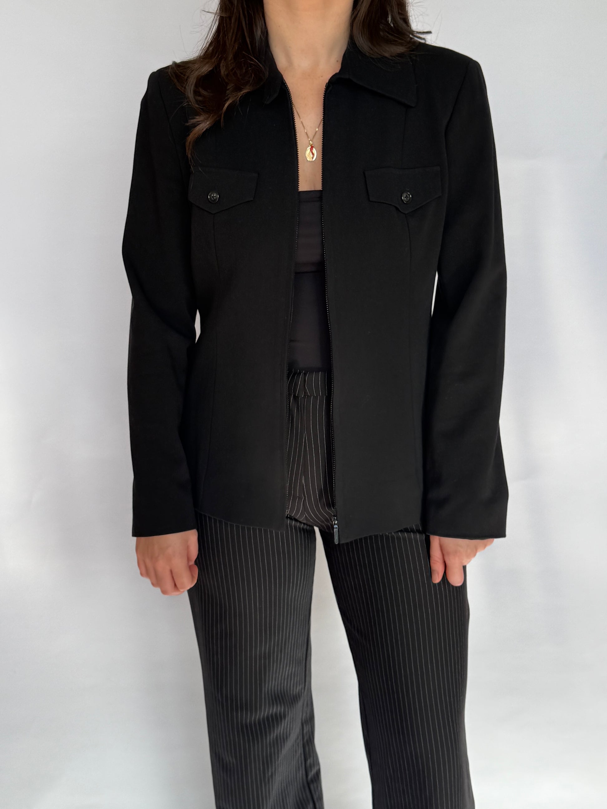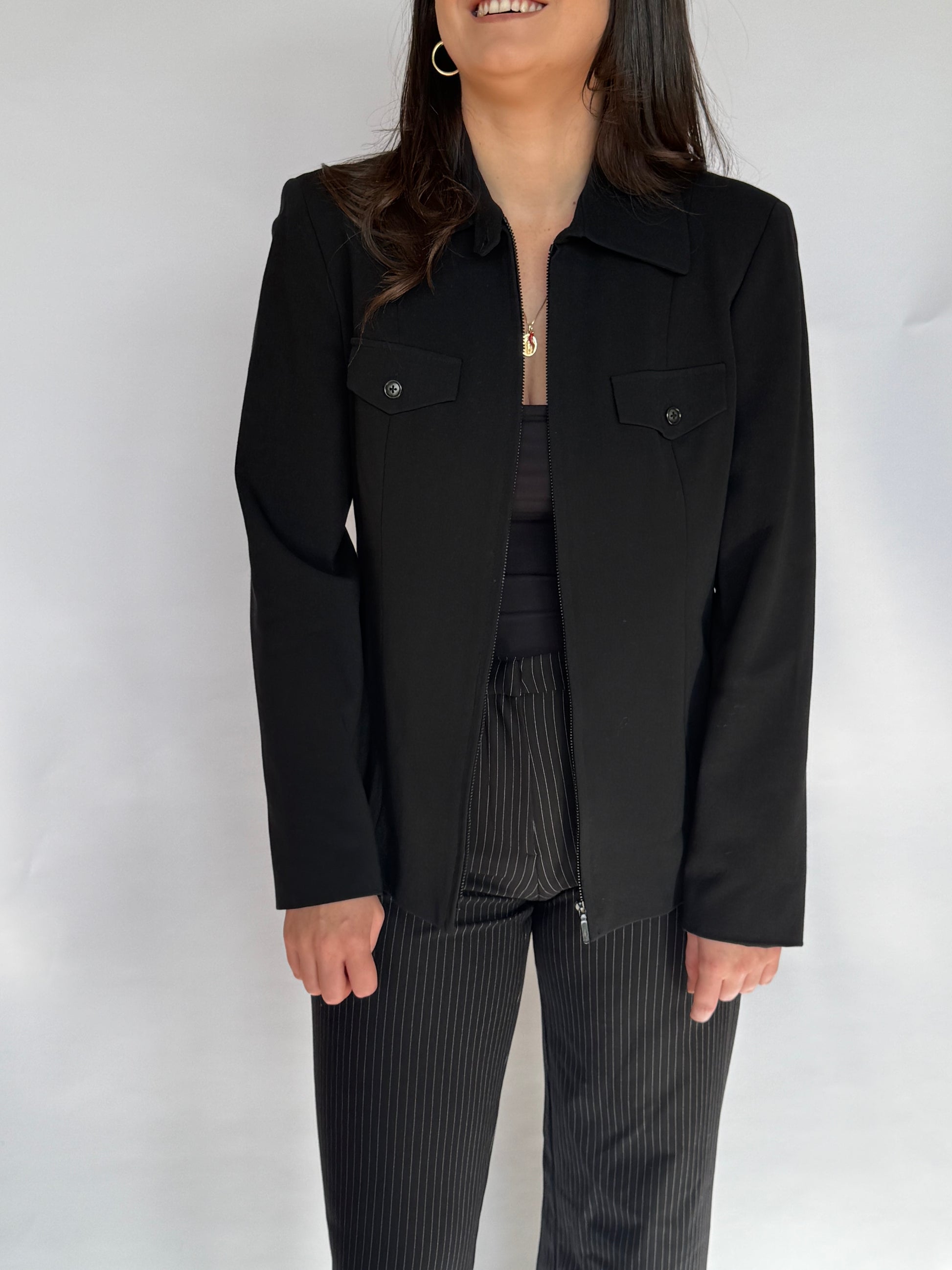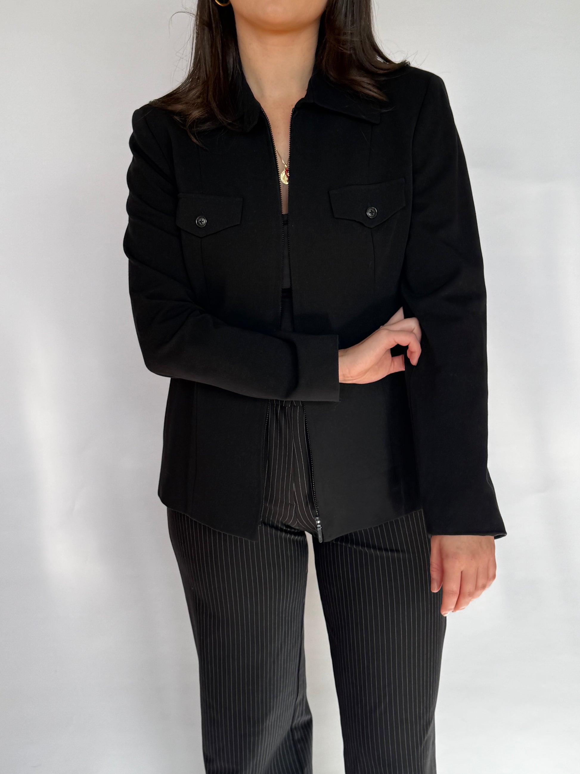 - Black utility jacket - lined with light shoulder pads, two faux pockets at the chest, zip up the front with a button closure at the collar.
