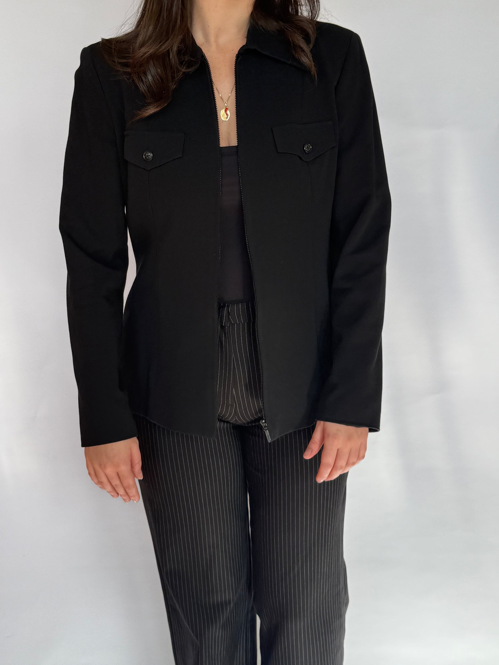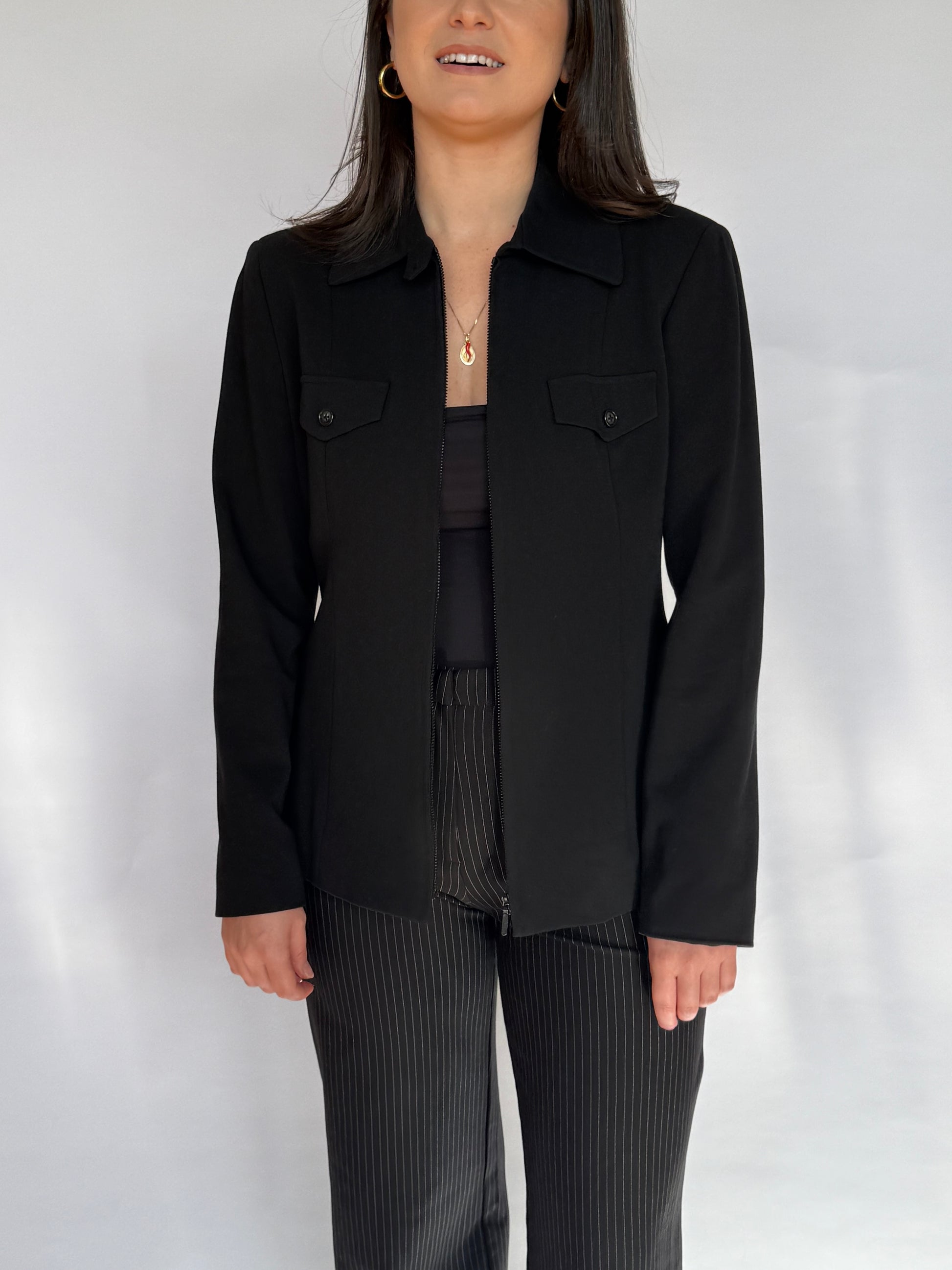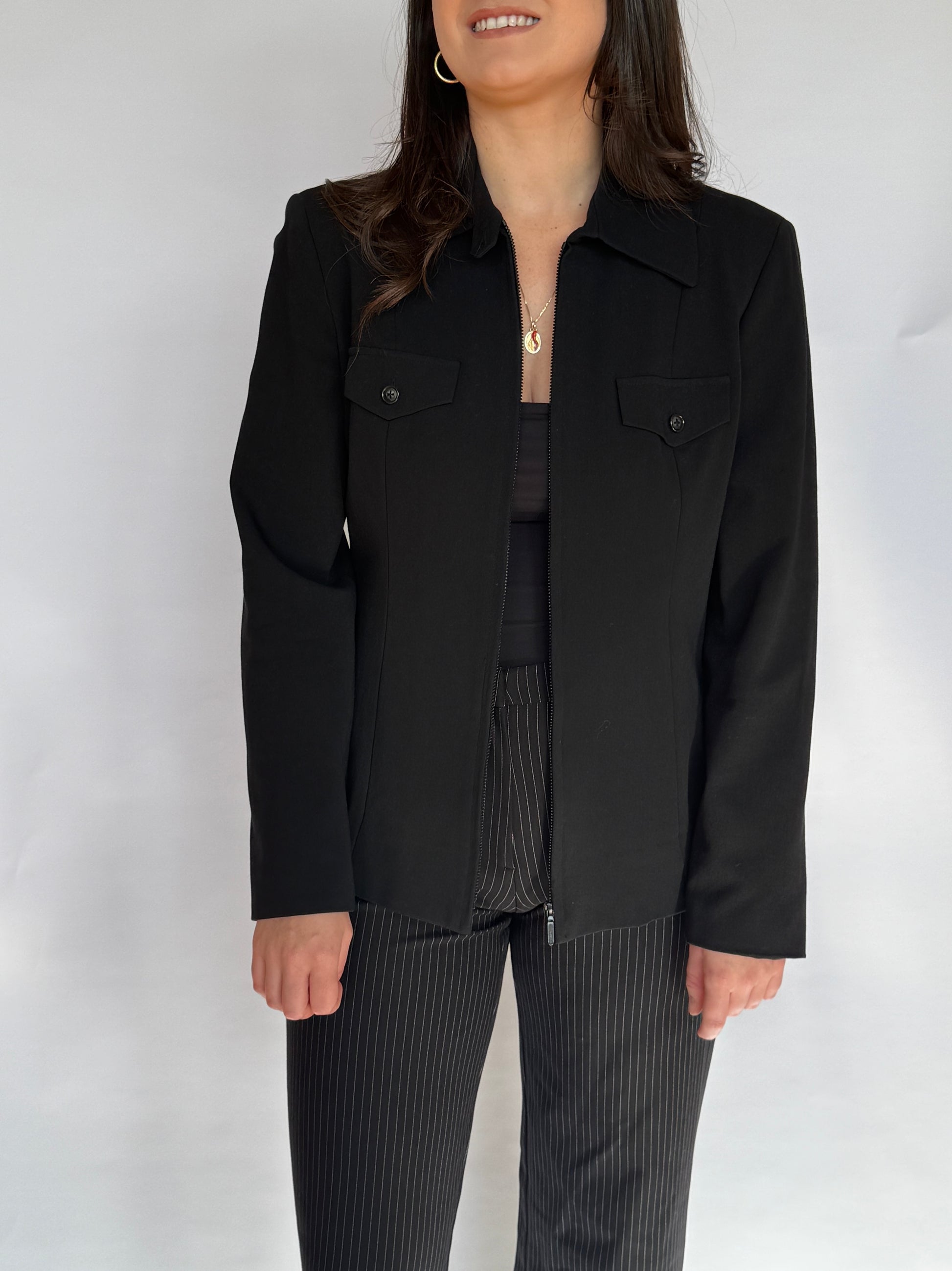 - Black utility jacket - lined with light shoulder pads, two faux pockets at the chest, zip up the front with a button closure at the collar.