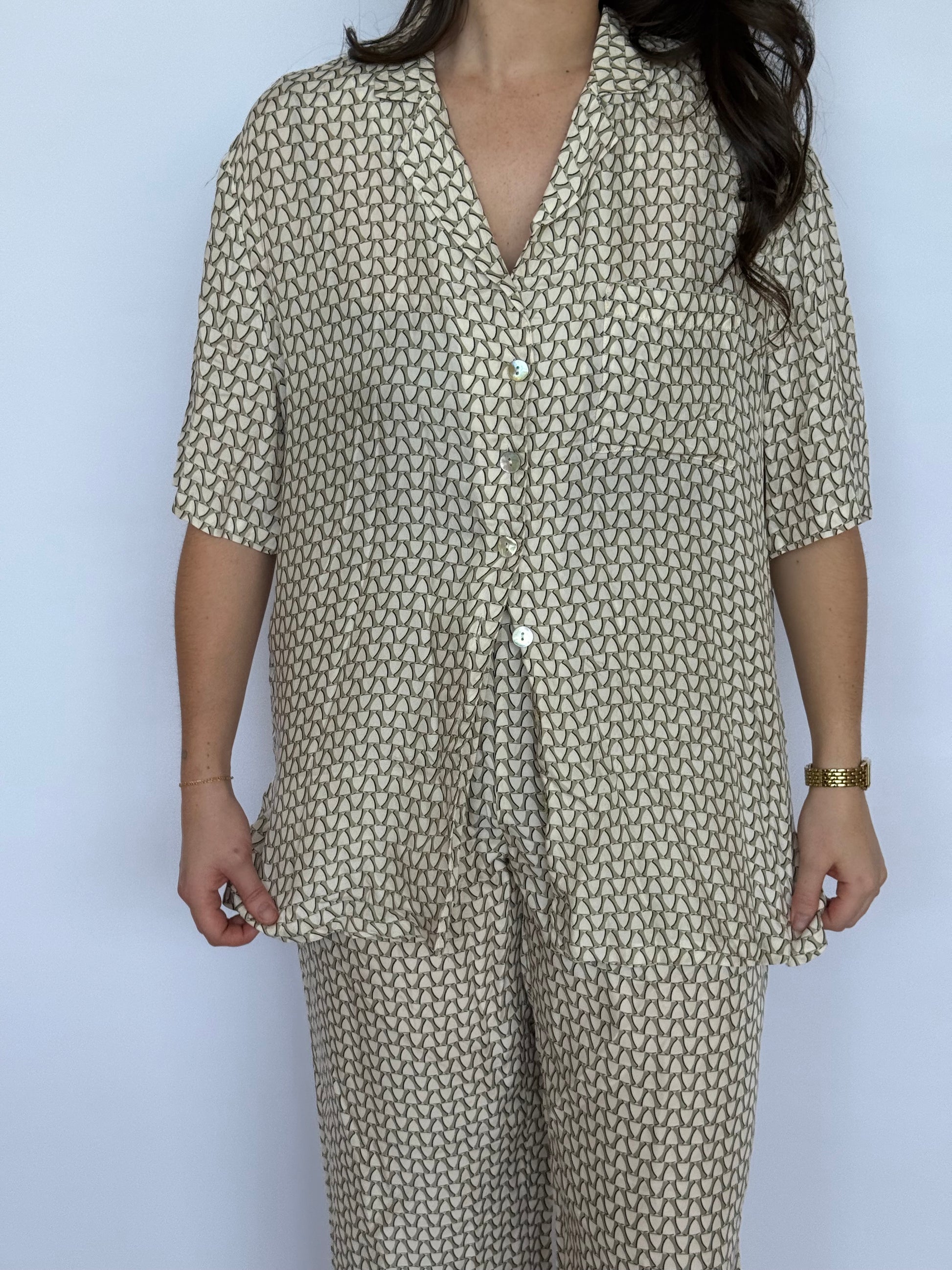 Two-piece matching set featuring an oversized collared shirt with abstract grey and cream print, six-button closure, and chest pocket. Paired with elasticated wide-leg pants with subtle flare, side pockets, and small leg slits for ease of movement. The luxe cupro-viscose blend drapes beautifully and has a silky feel. Style the set together for an effortless coordinated look, or separate the pieces - wear the shirt with jeans or the pants with a fitted tank. Perfect for brunch, casual work days, or elevated weekend wear.