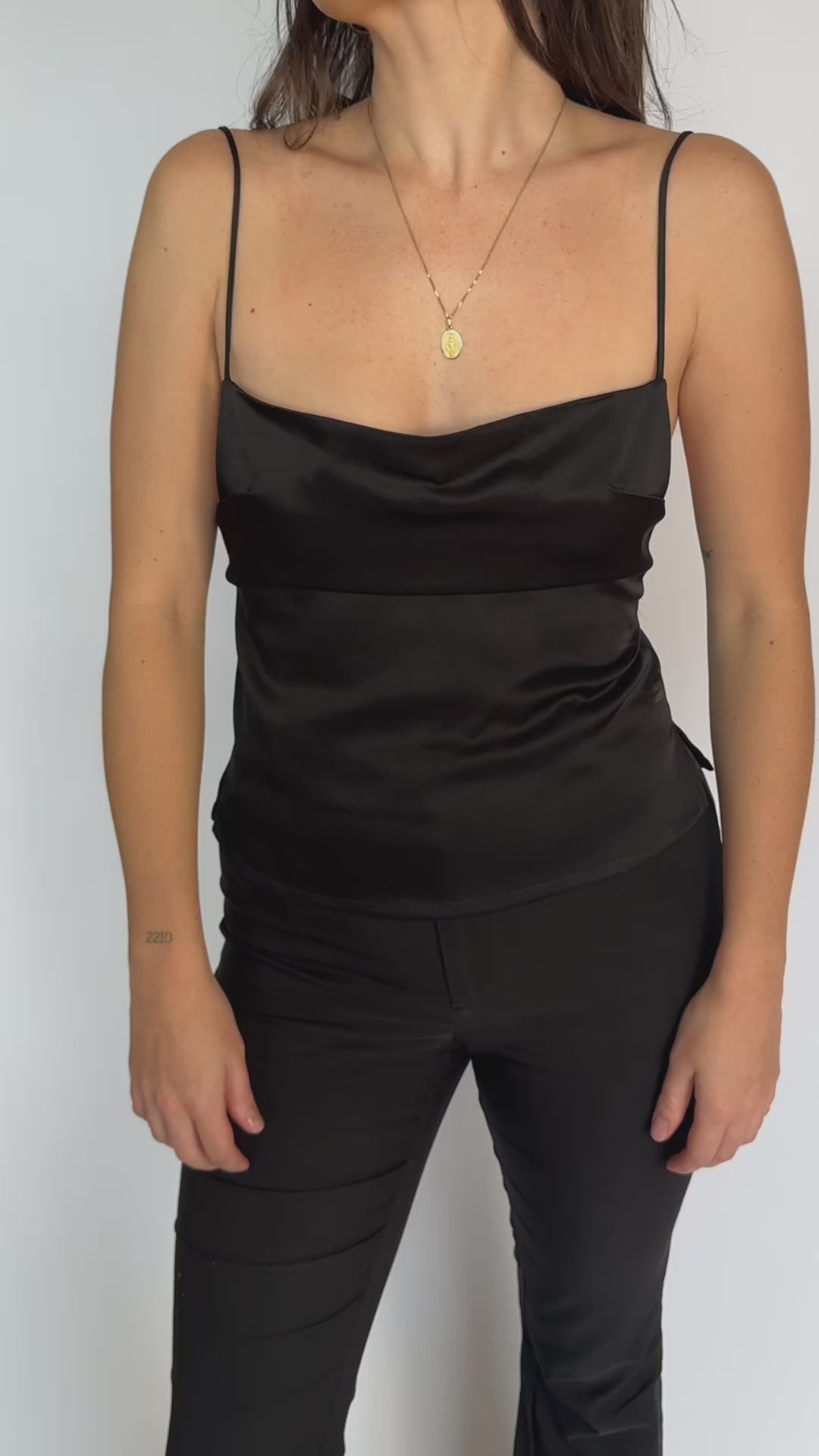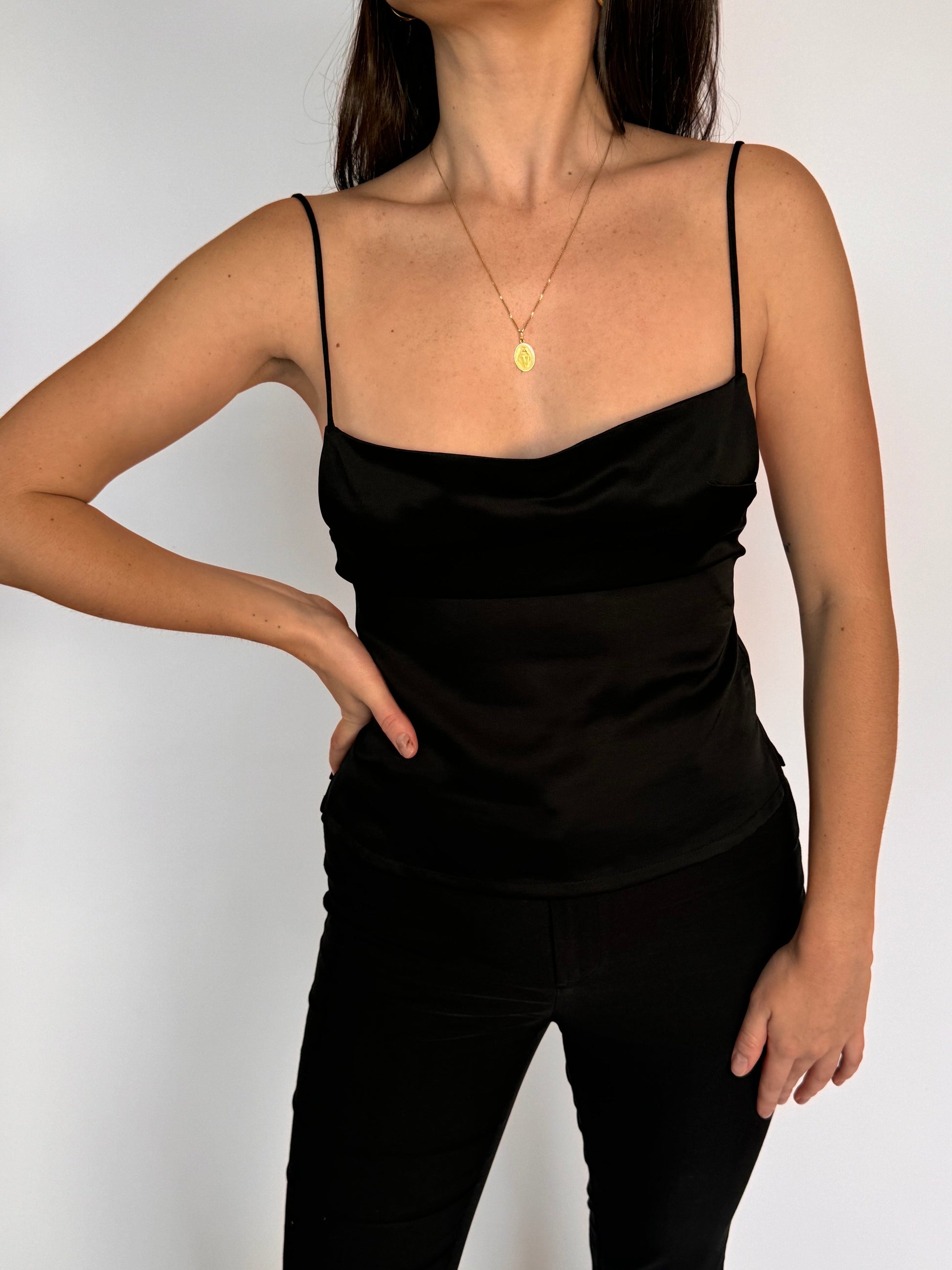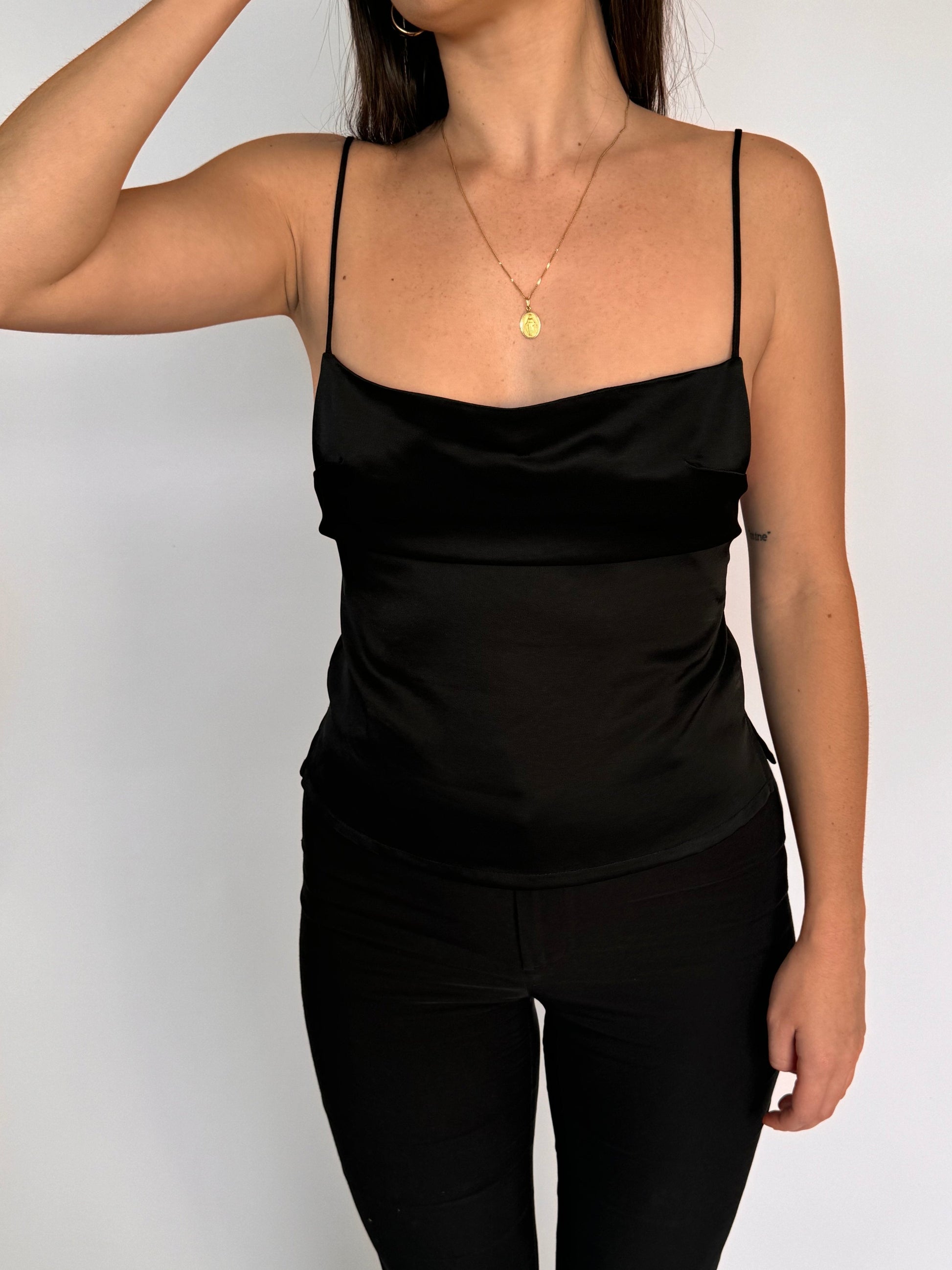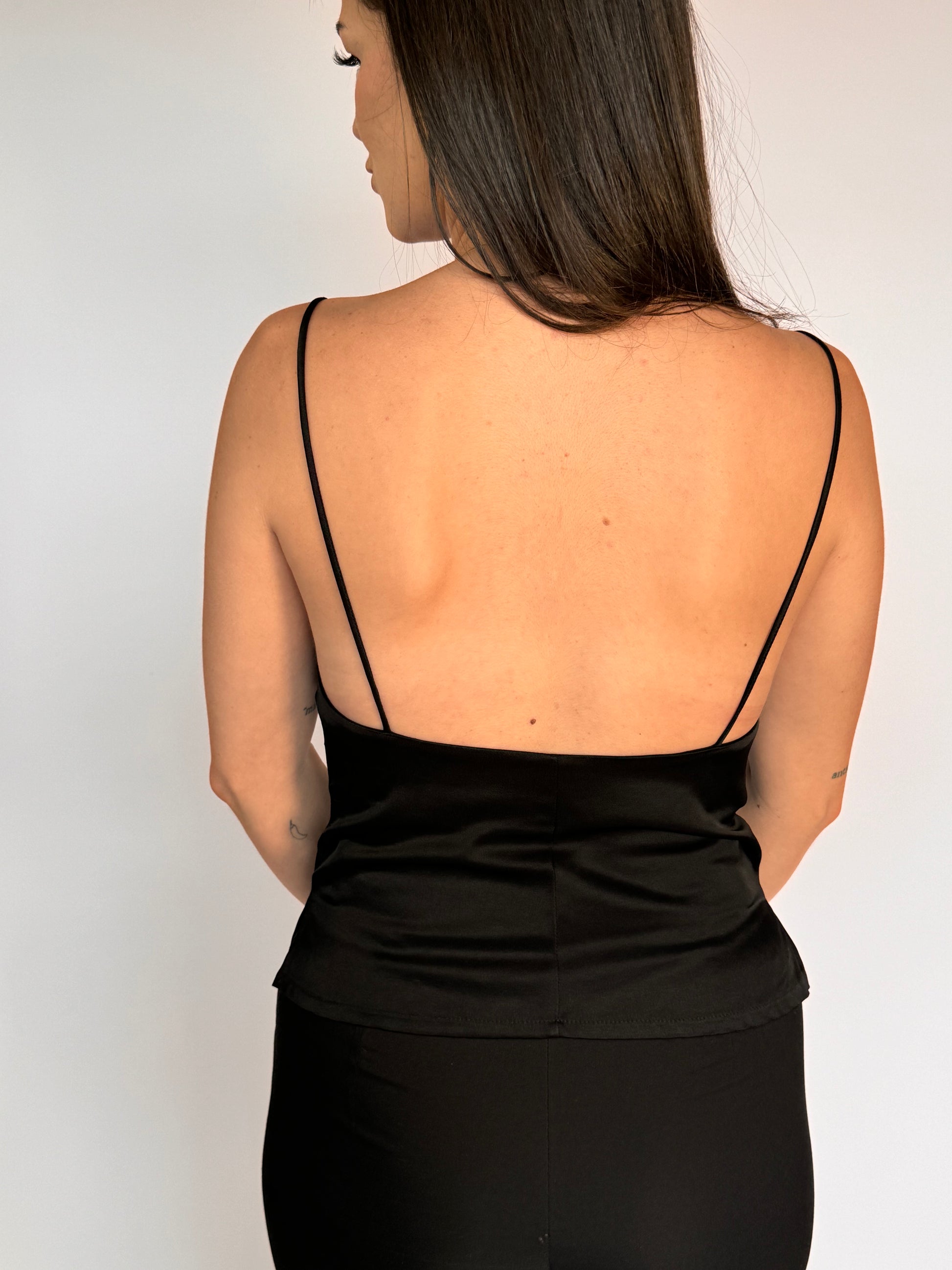 - Black strappy singlet with low back and small spilts at the side