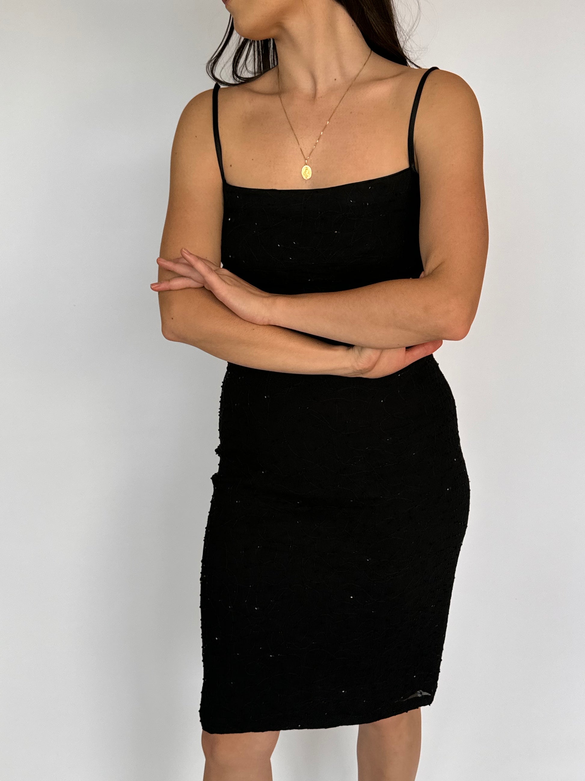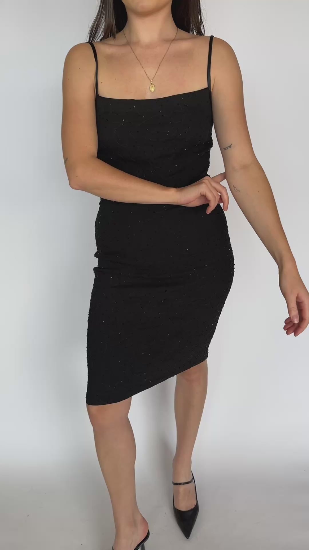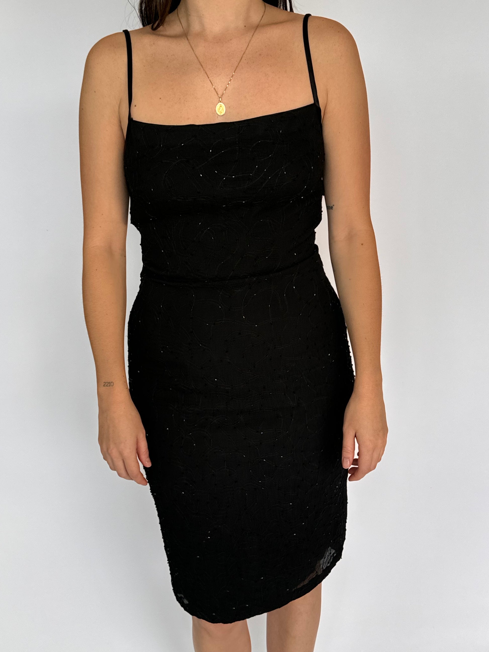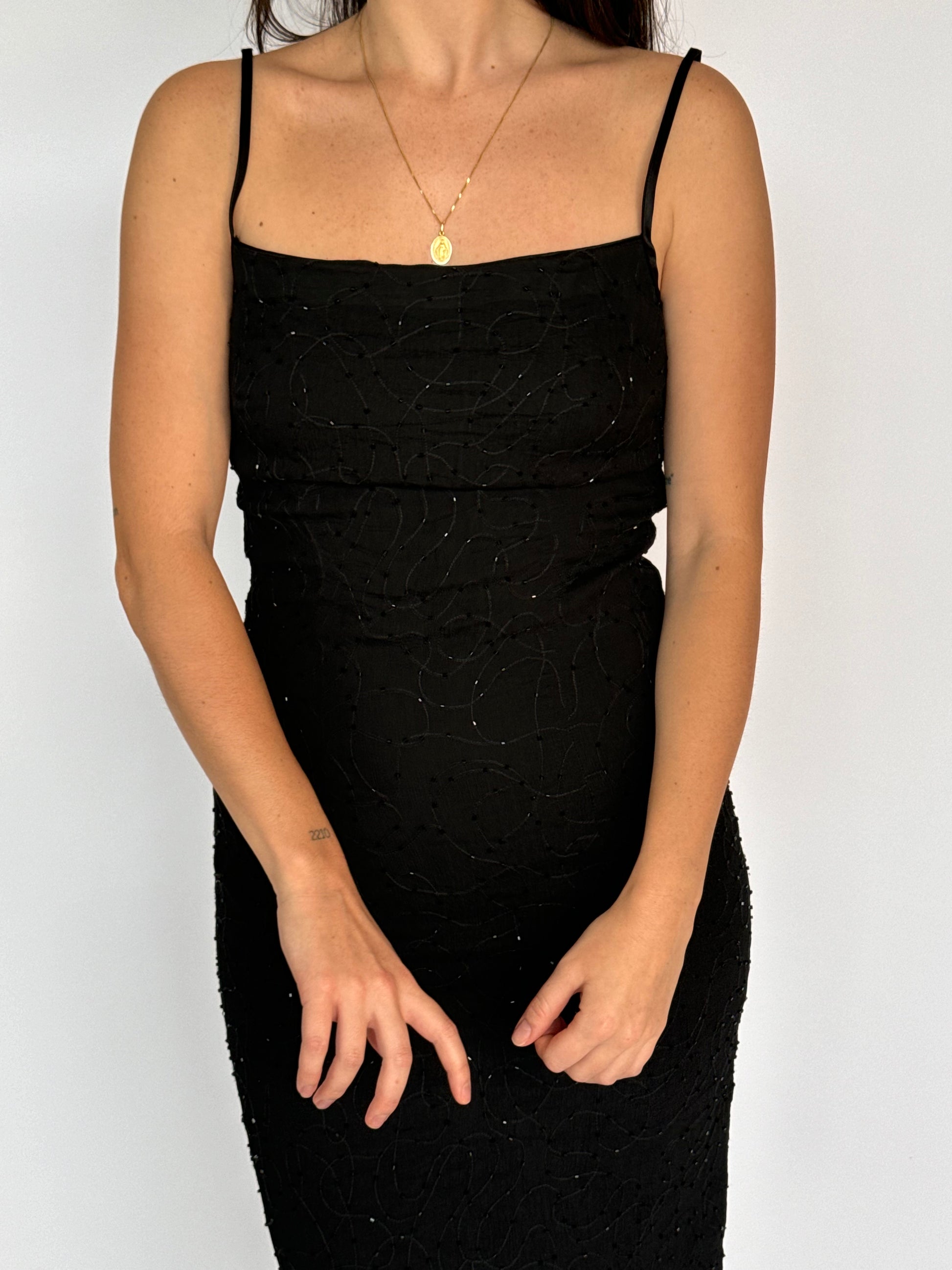 - Silk beaded midi dress with black piping at the straps and neckline & double lined