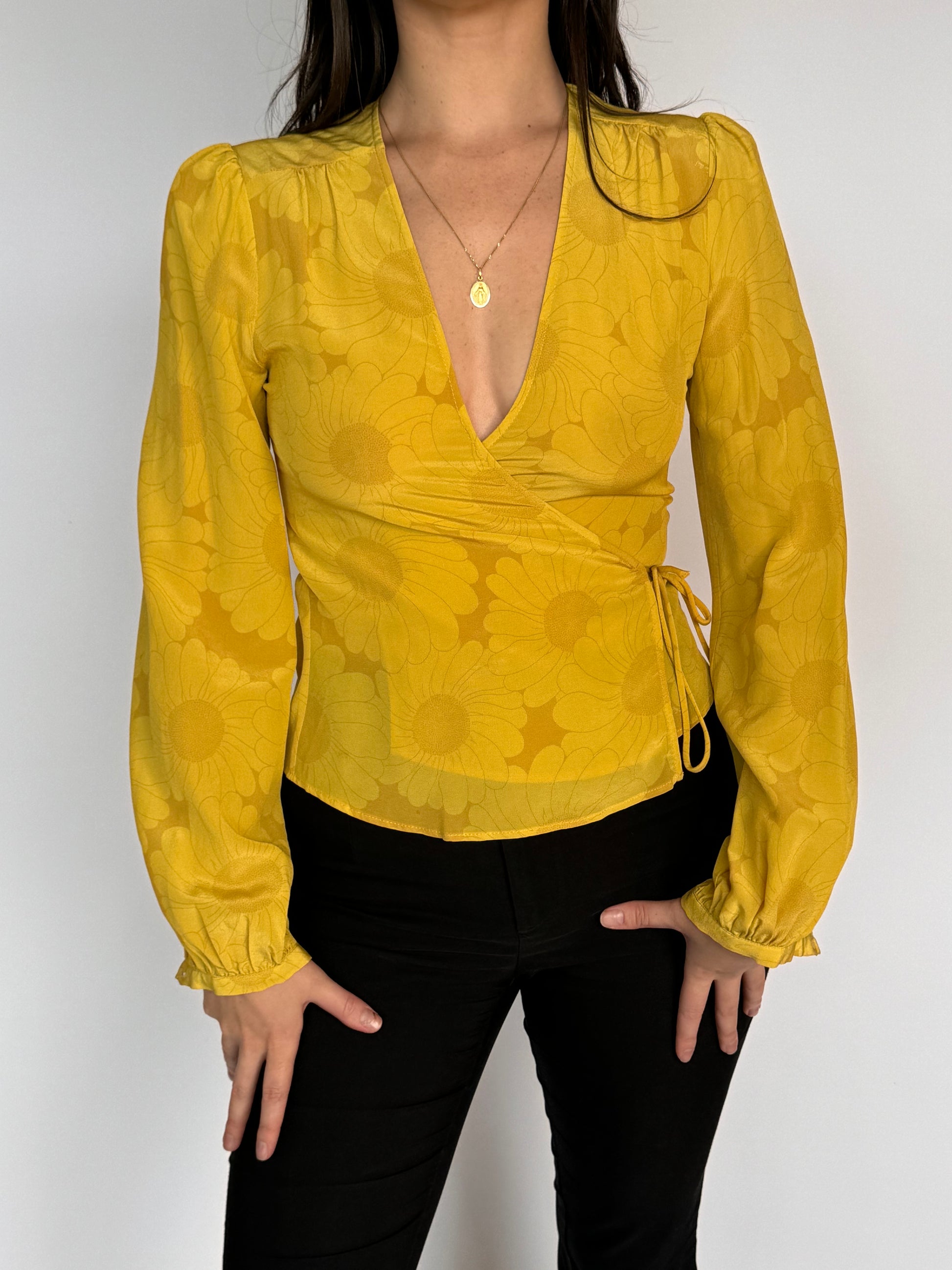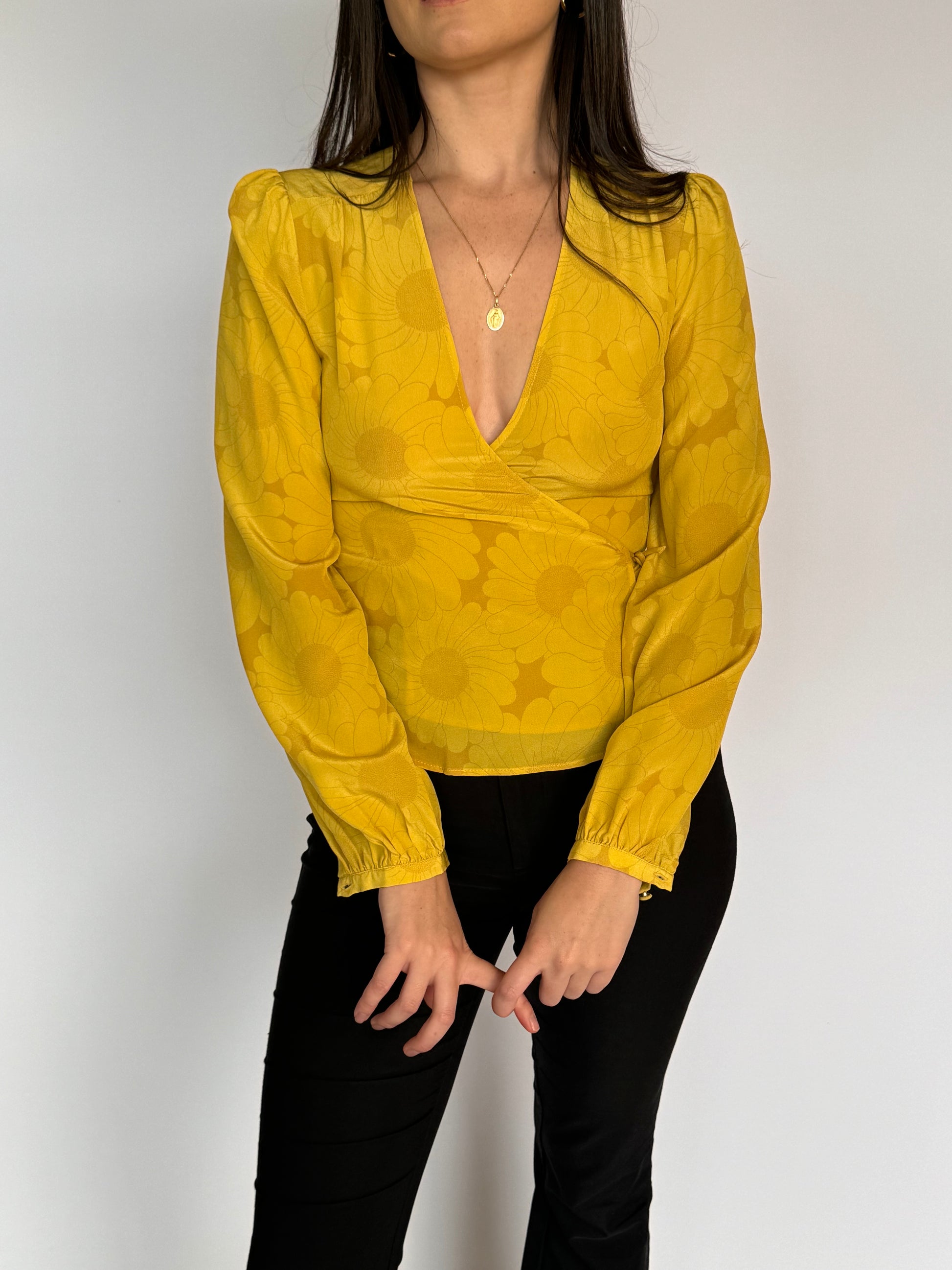 - Yellow wrap long sleeve top with a flower print and two buttons at each sleeve and a spare one on the tag
