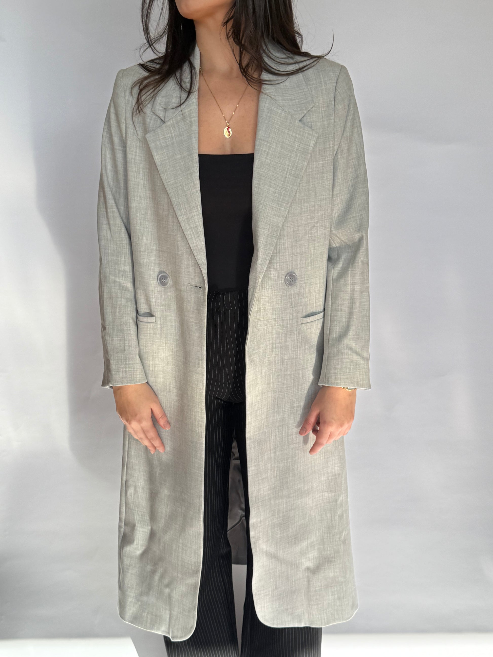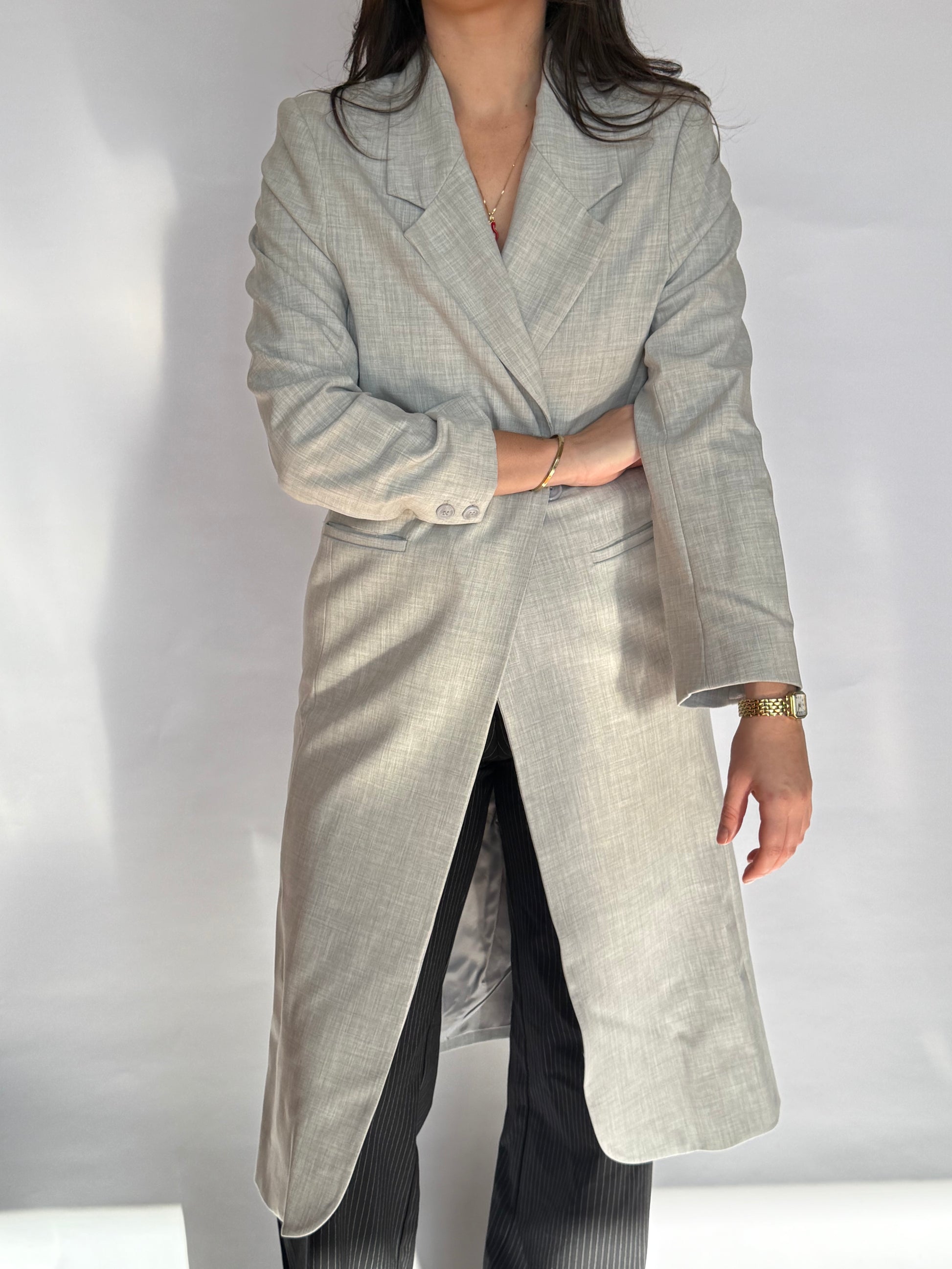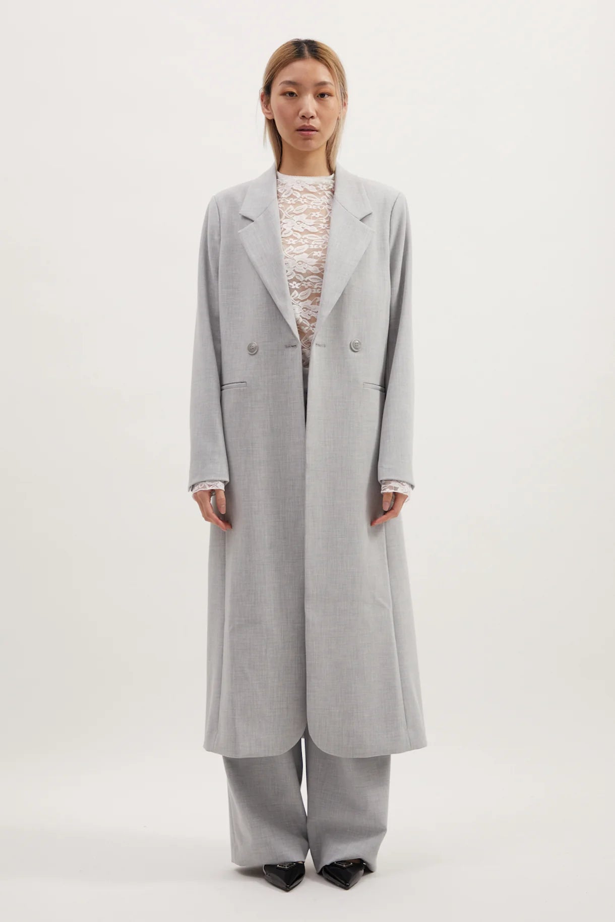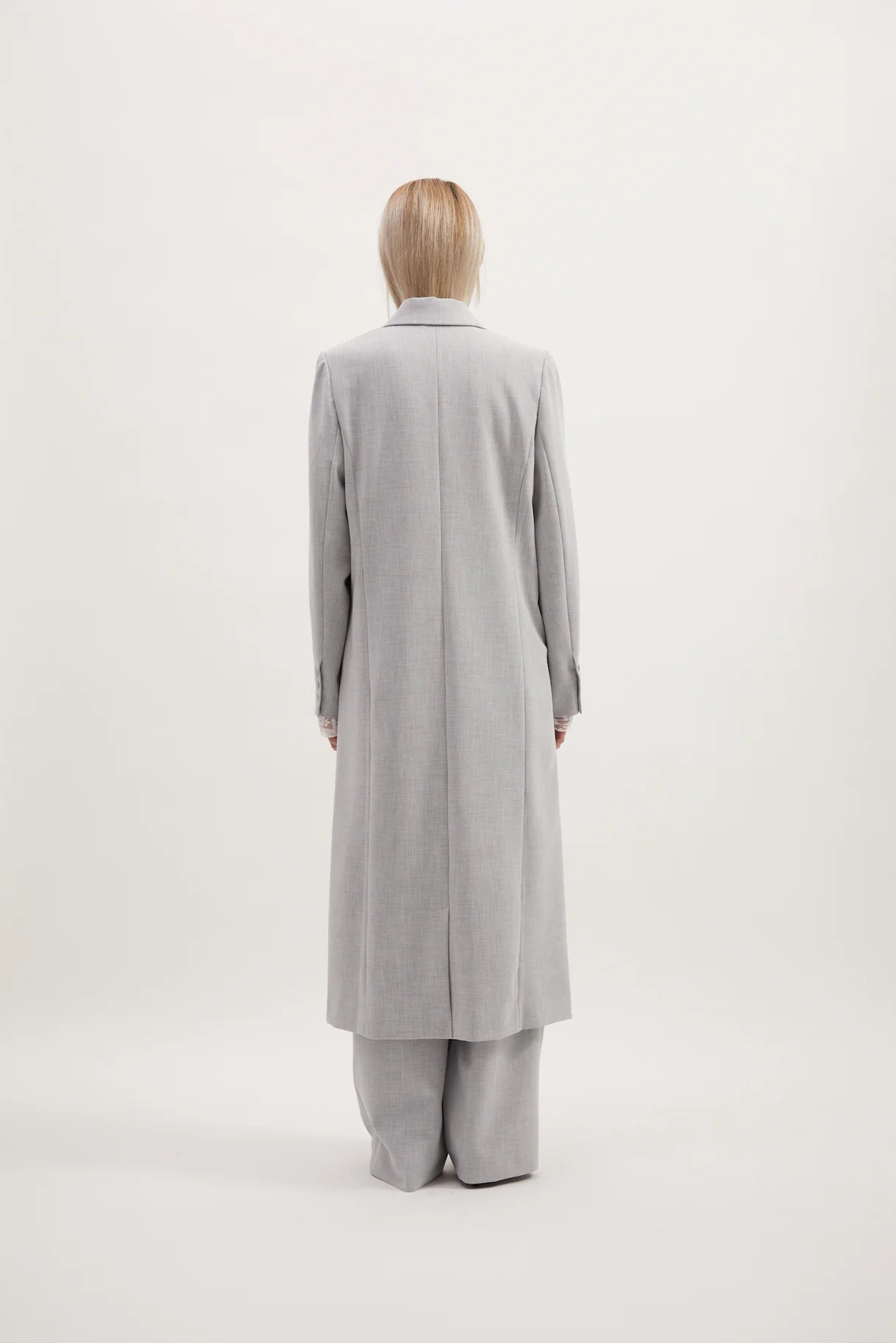 - Tailored longline coat that comes in a modern grey marle suiting. Featuring lapel collars, welt pockets at the waist and fastens with button closure. The perfect all-year-round staple, designed to be worn for years to come.