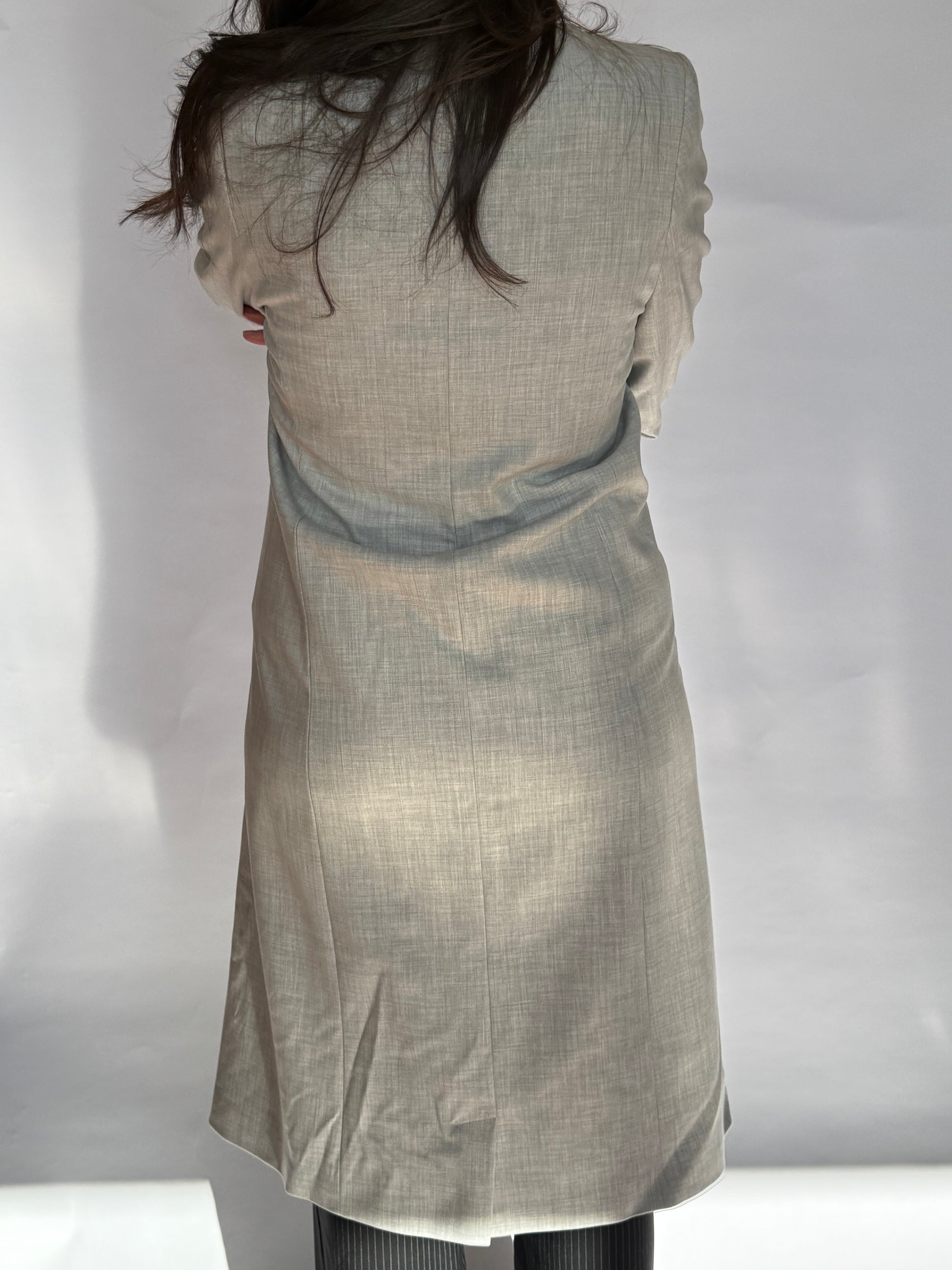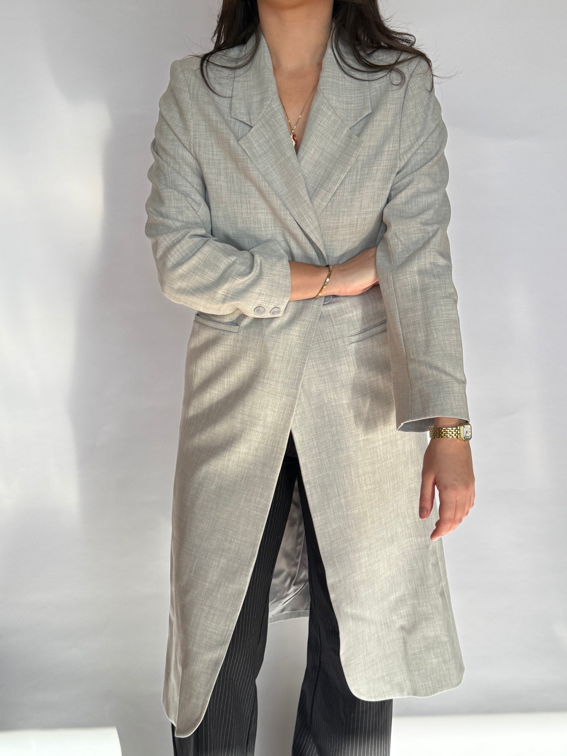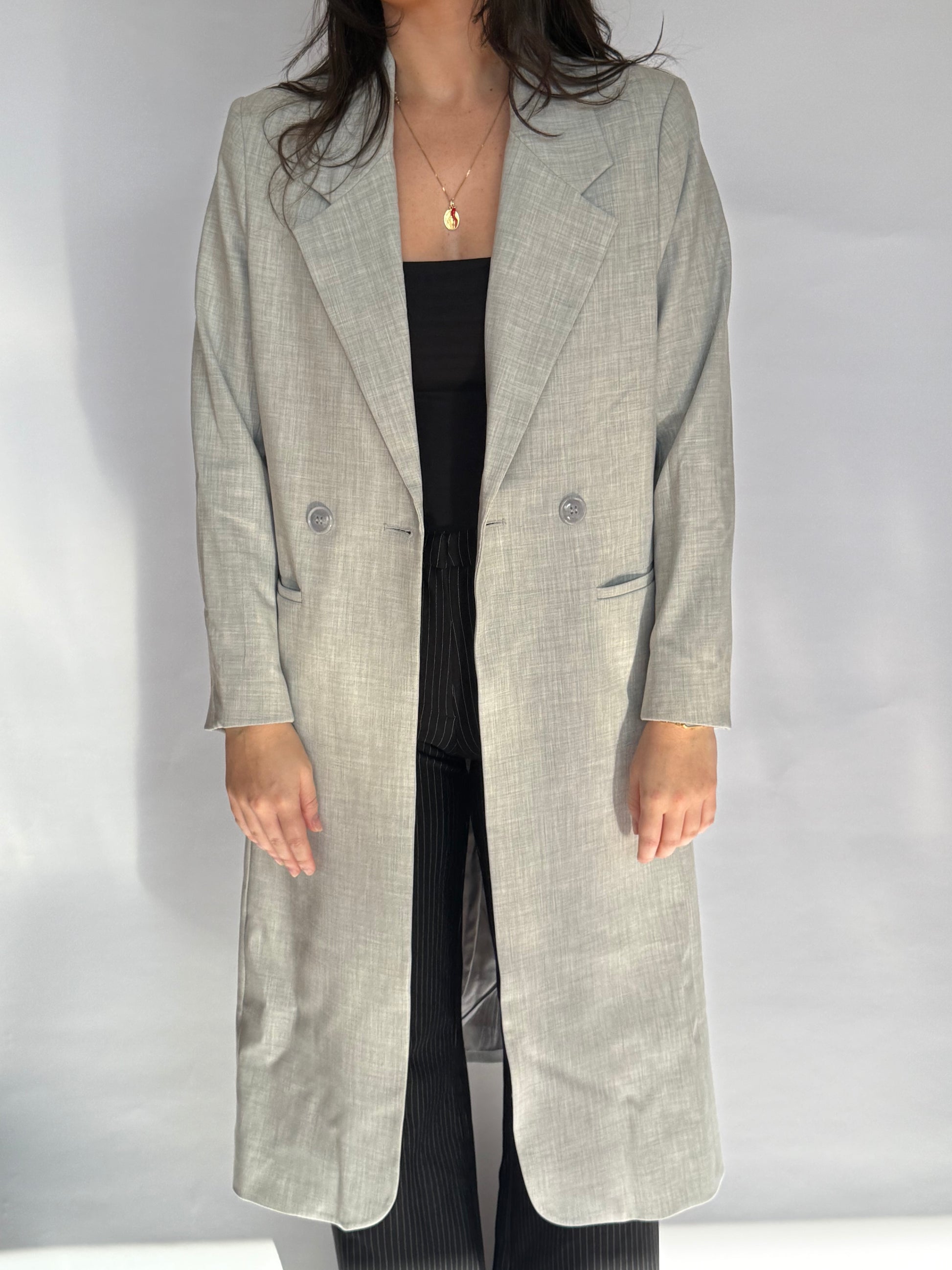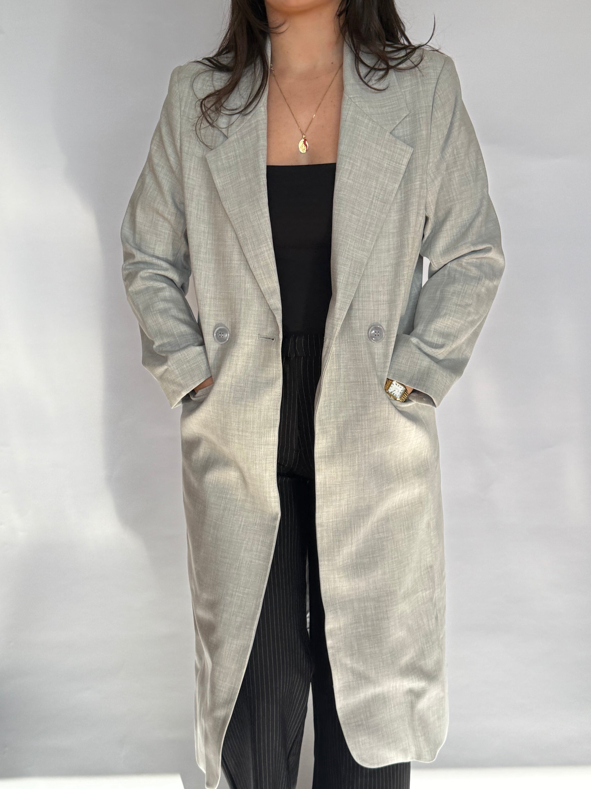 - Tailored longline coat that comes in a modern grey marle suiting. Featuring lapel collars, welt pockets at the waist and fastens with button closure. The perfect all-year-round staple, designed to be worn for years to come.