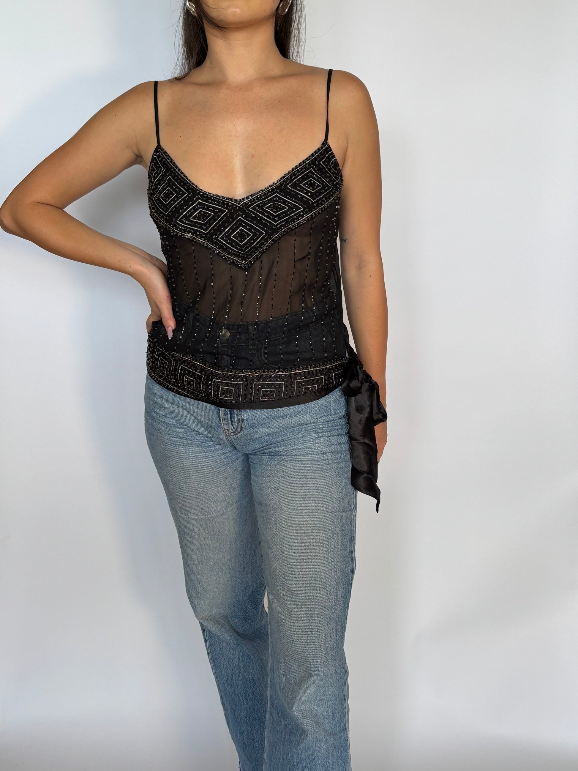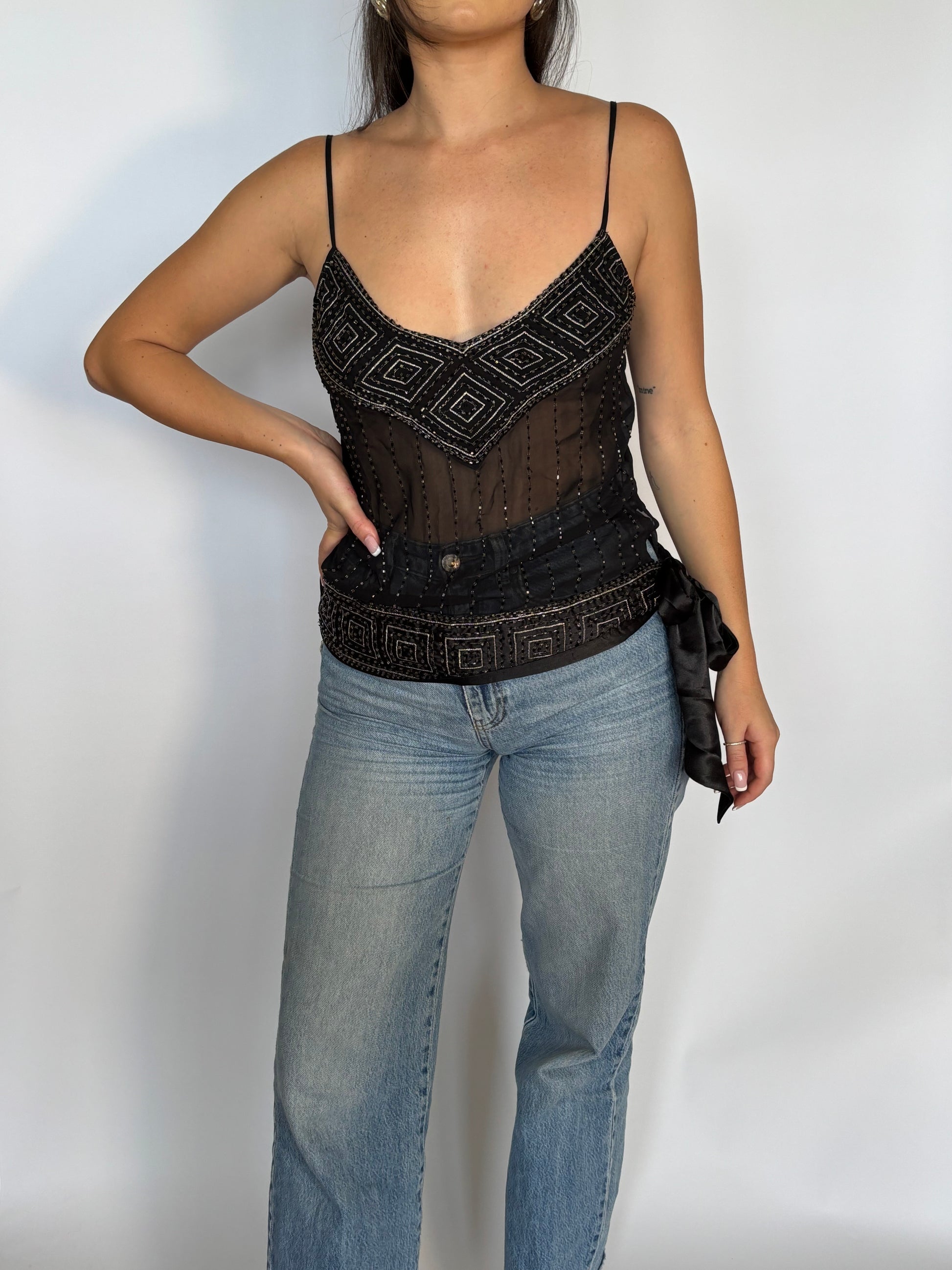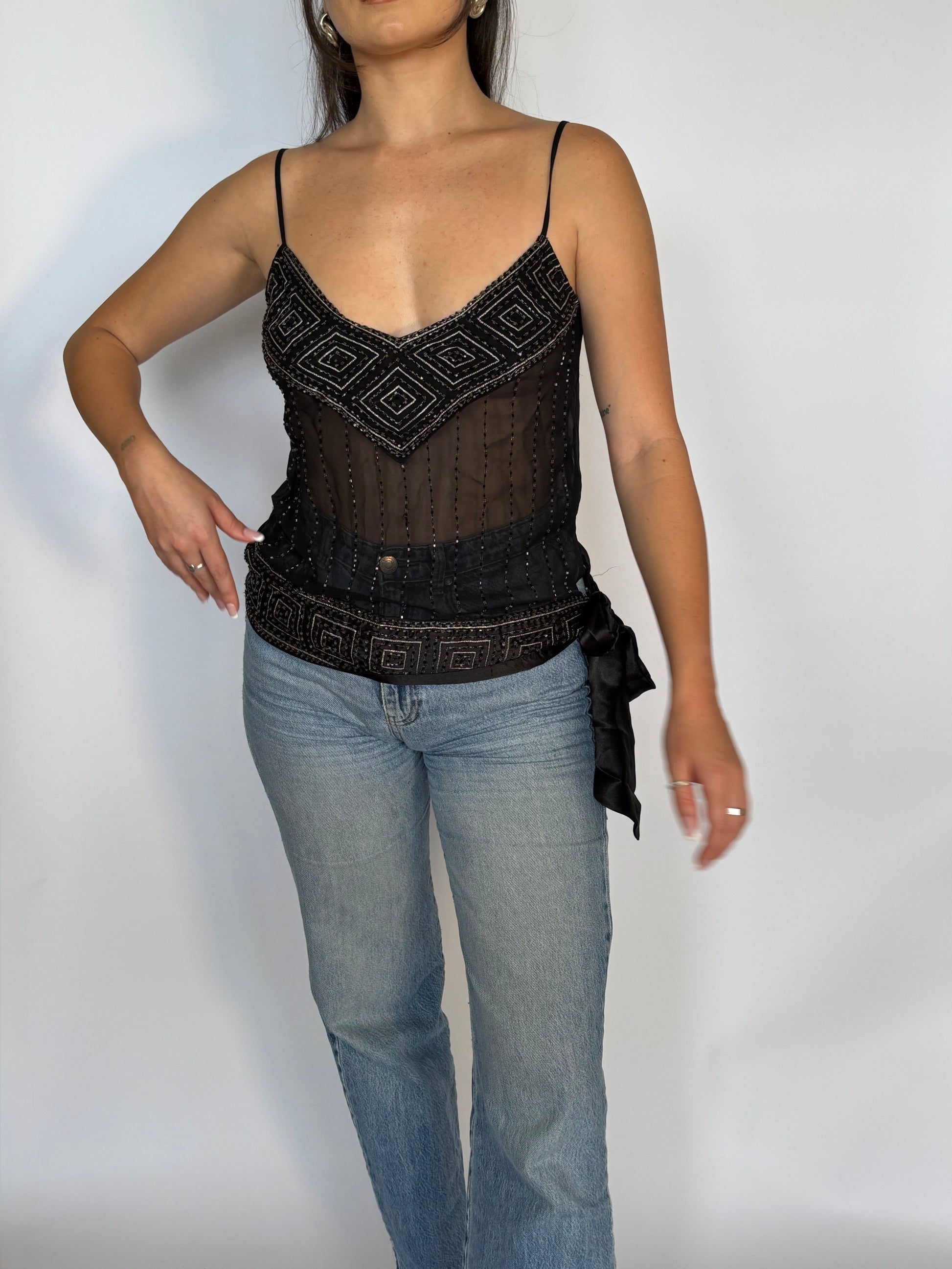 - V-neck tank with sequins, with a tie to the side and adjustable straps