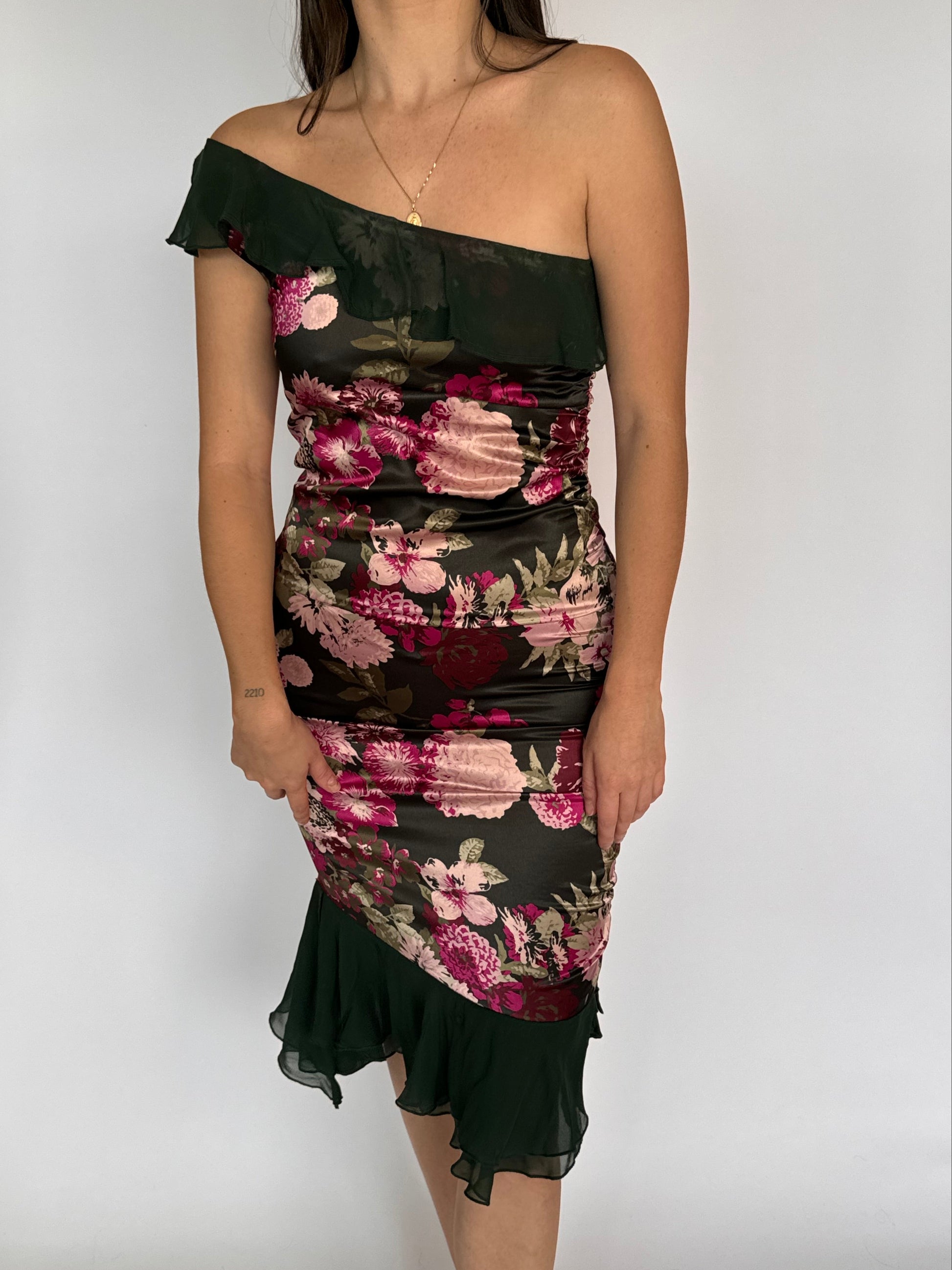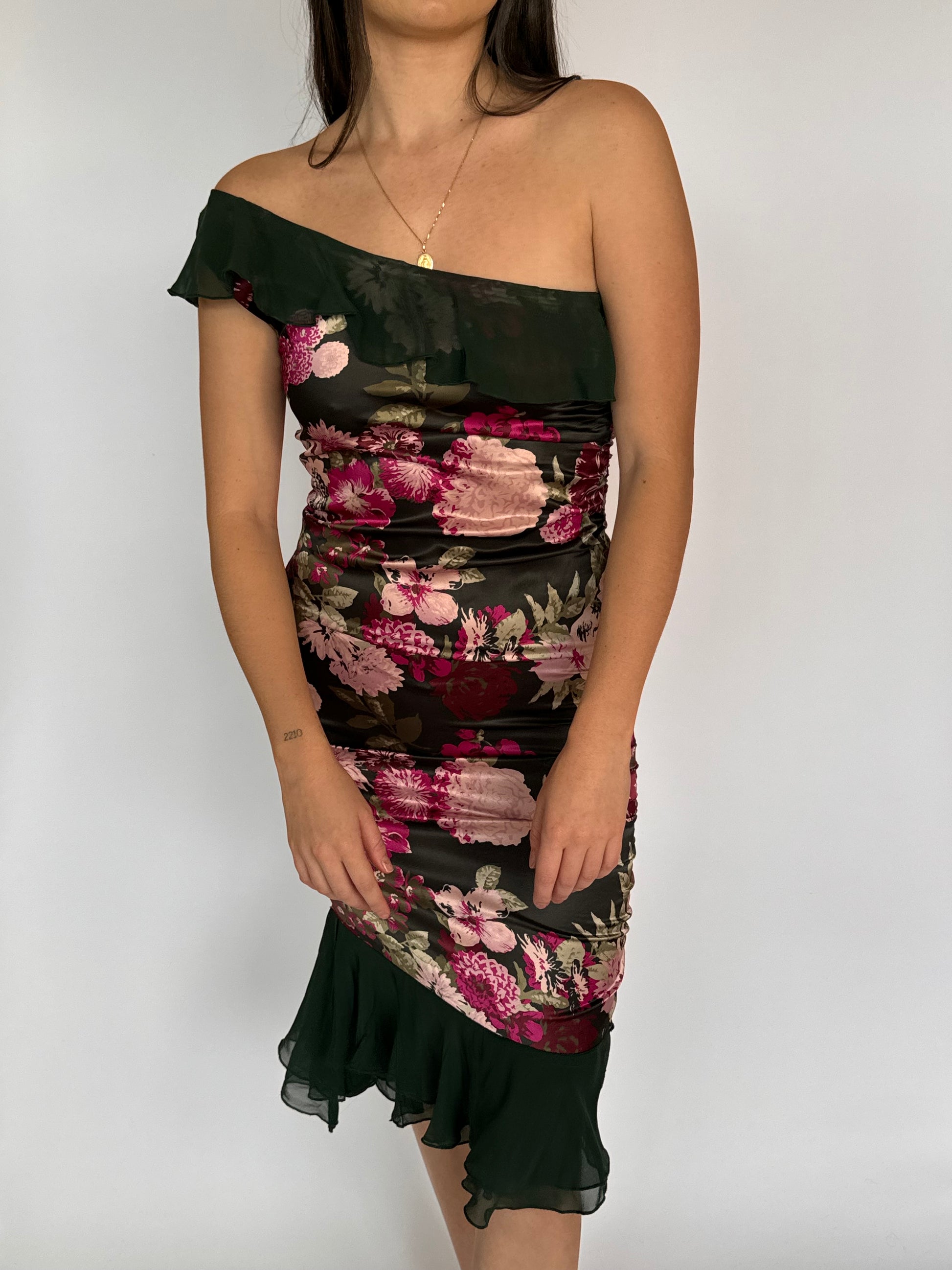 - Off shoulder floral printed asymmetrical dress with ruching at the side and double frill at the neckline and hem