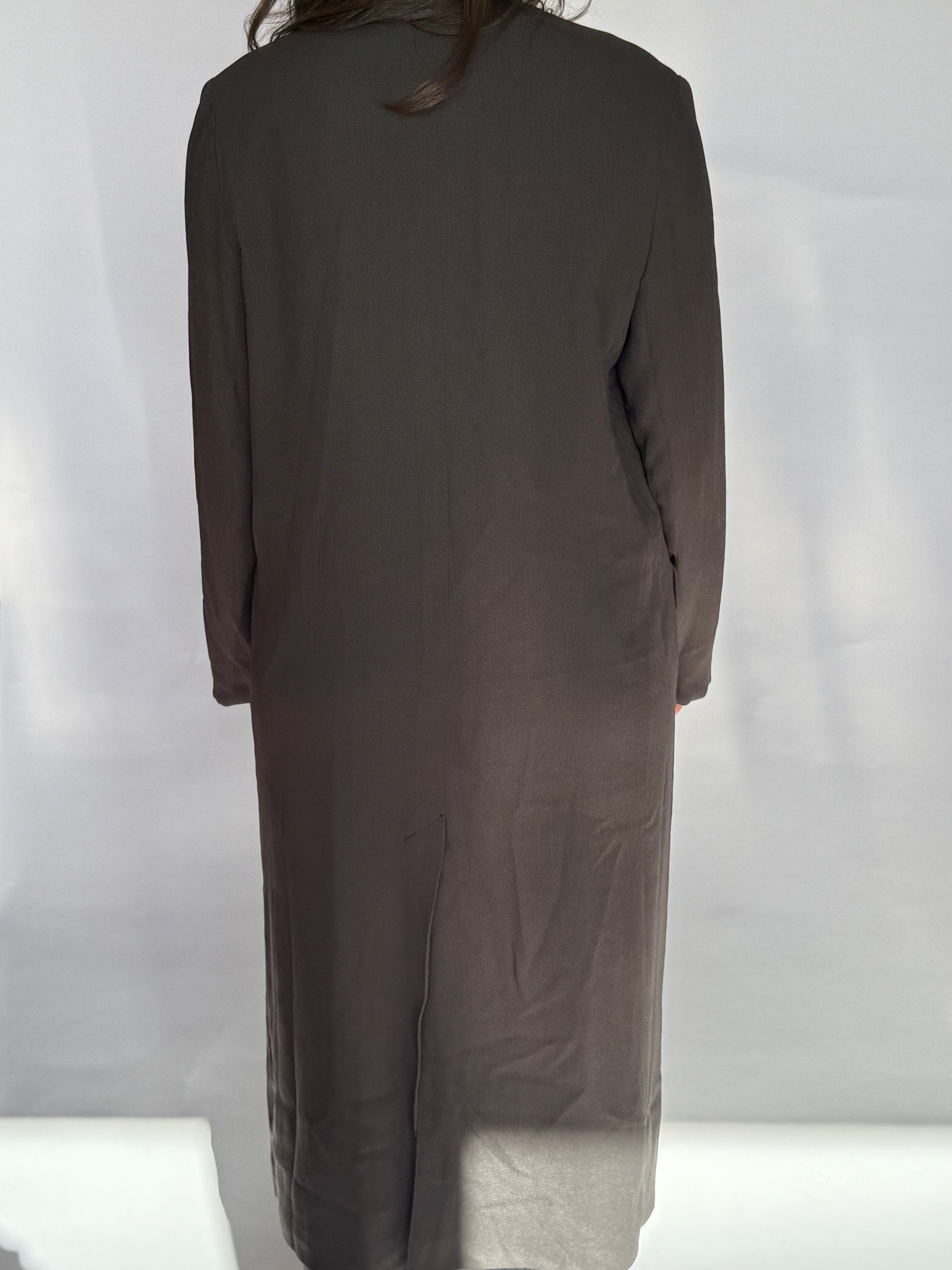 - Light khaki overcoat with four buttons down the front, two pockets at the hip and a slit up the back