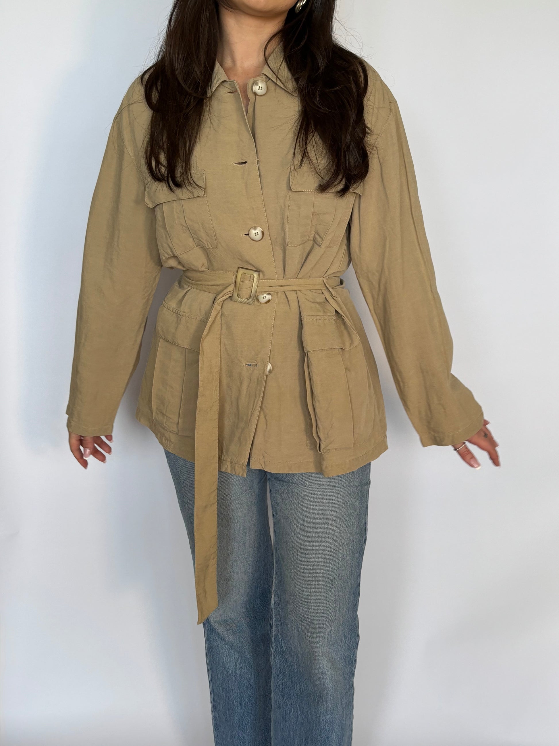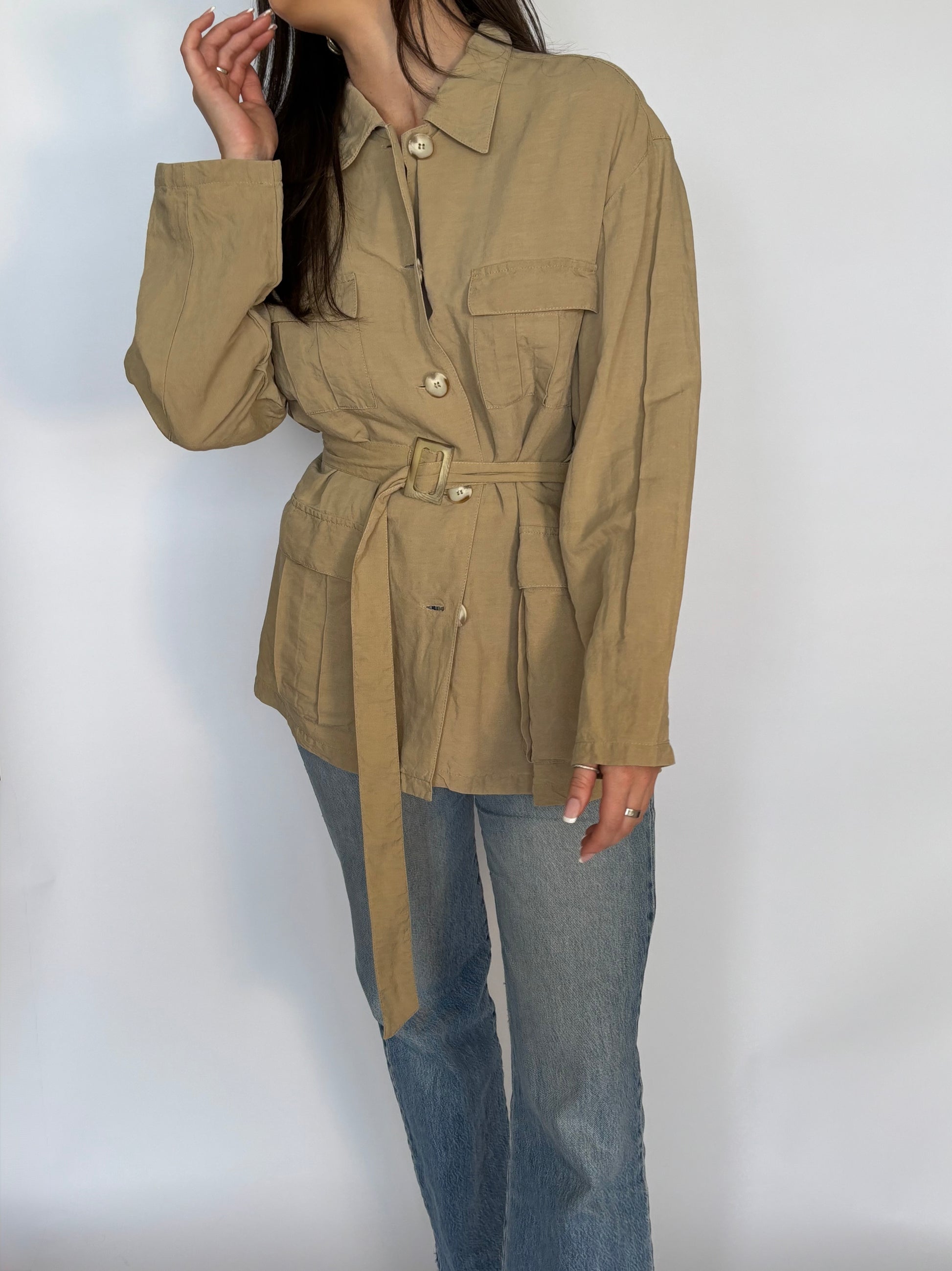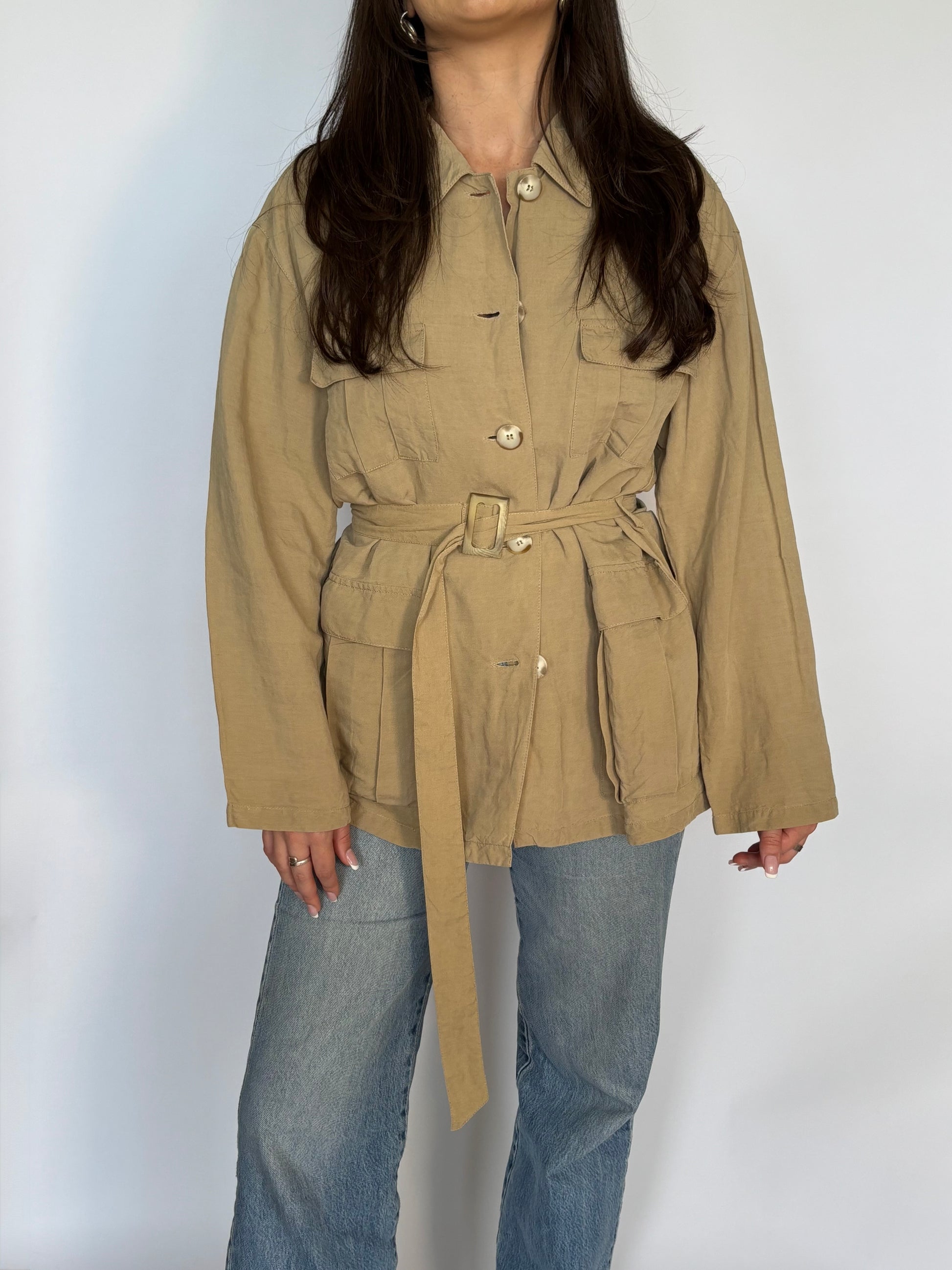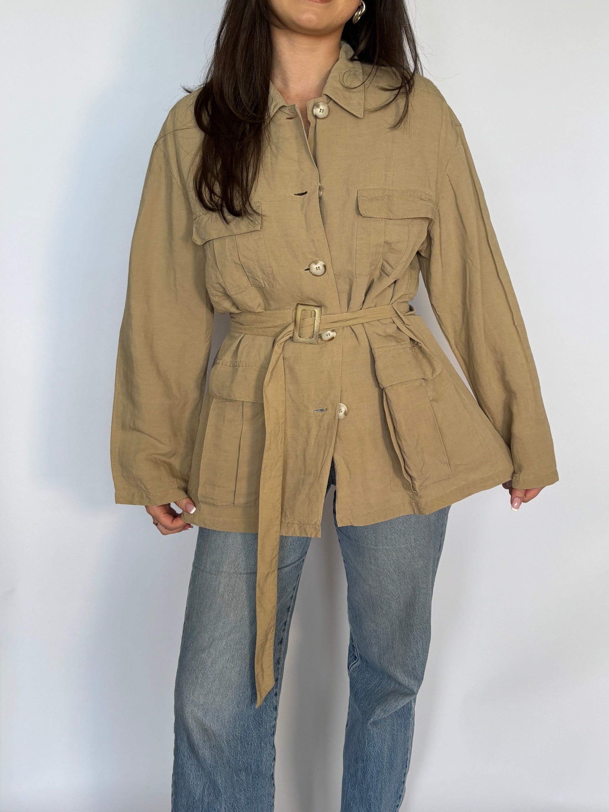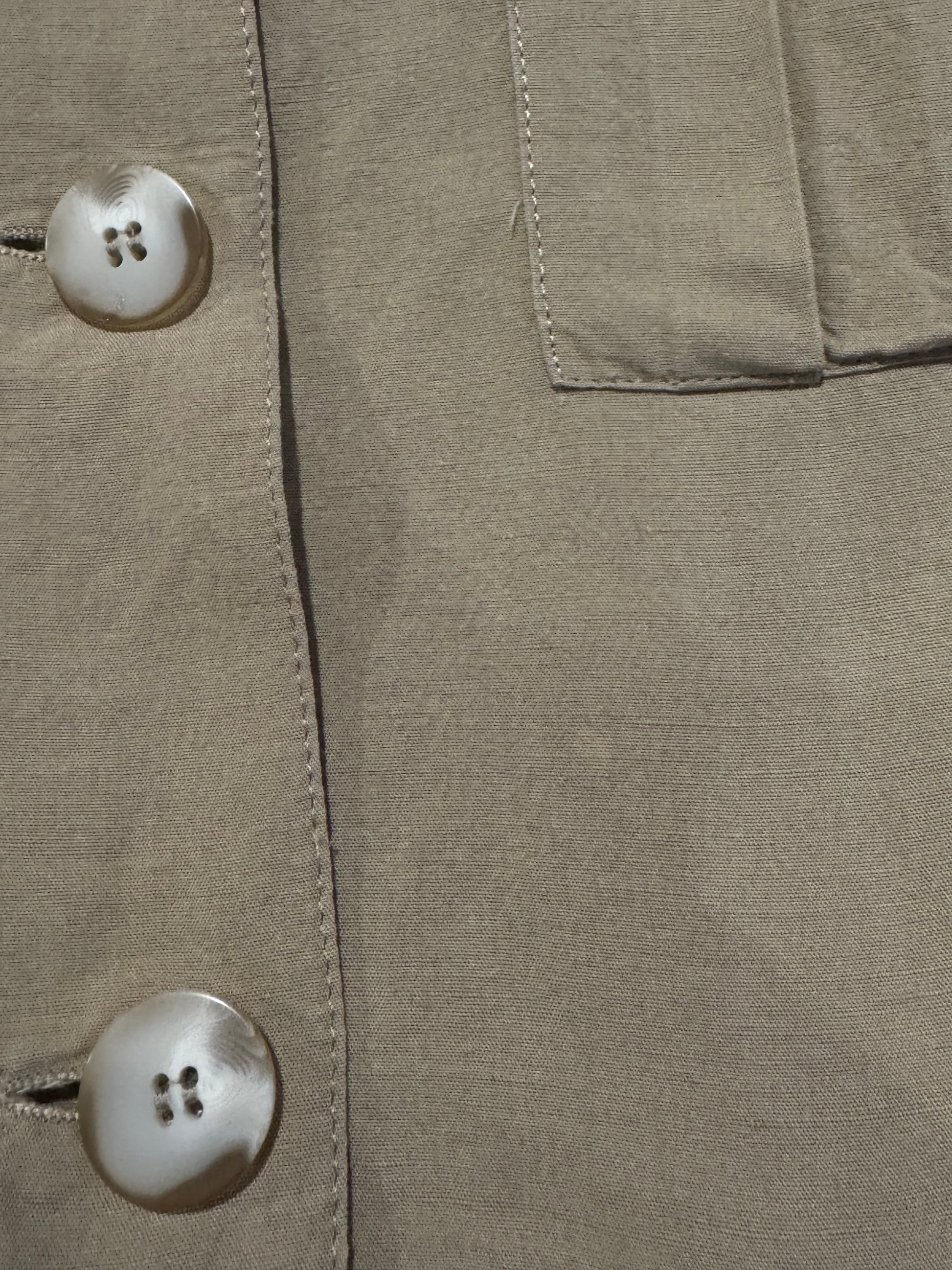 - Light linen blend tan collared top with five tortoiseshell resin buttons up the front and two pockets at the chest and two at the hip, belt loops and a belt with a tortoiseshell resin buckle and a split up the back