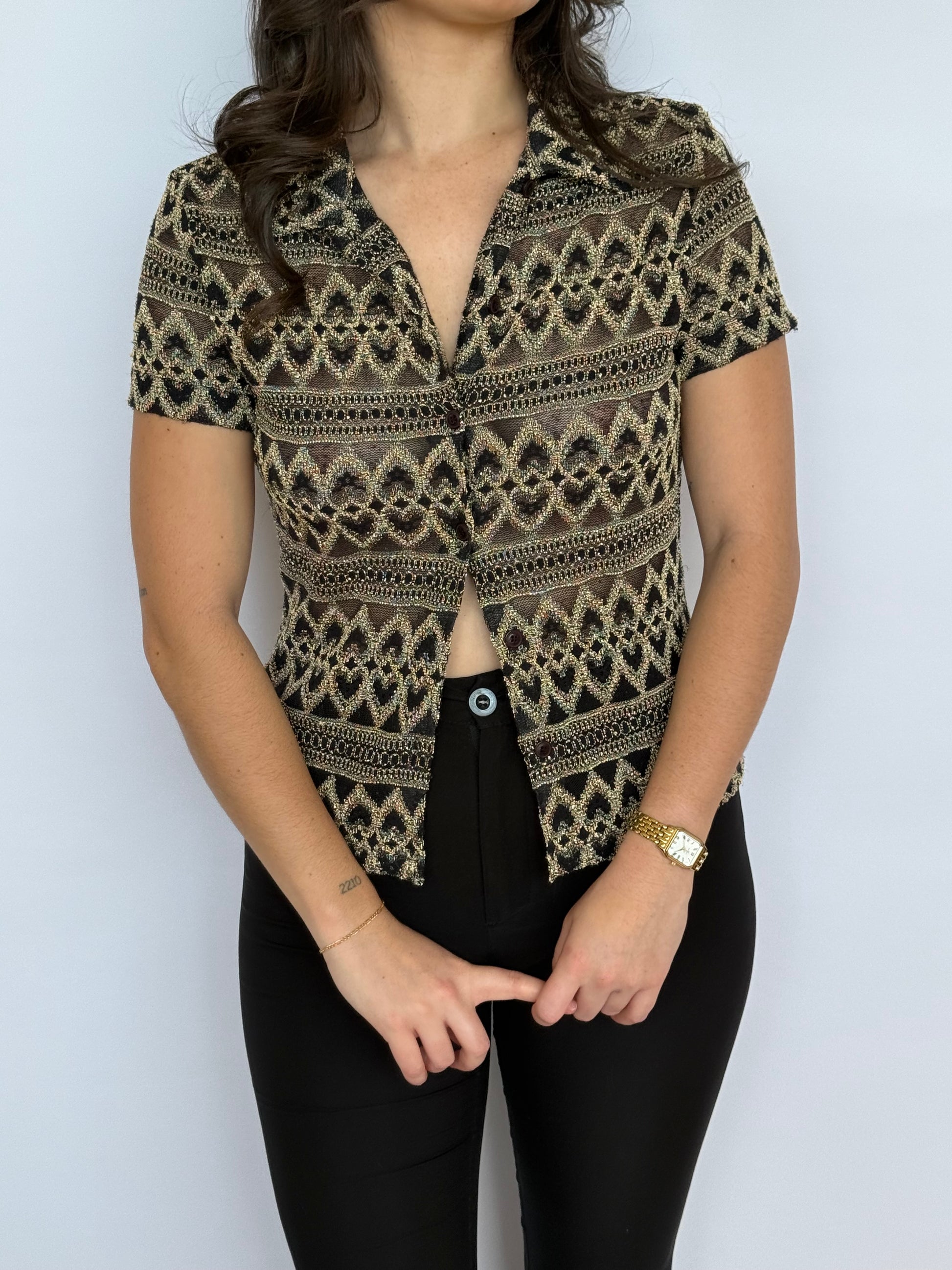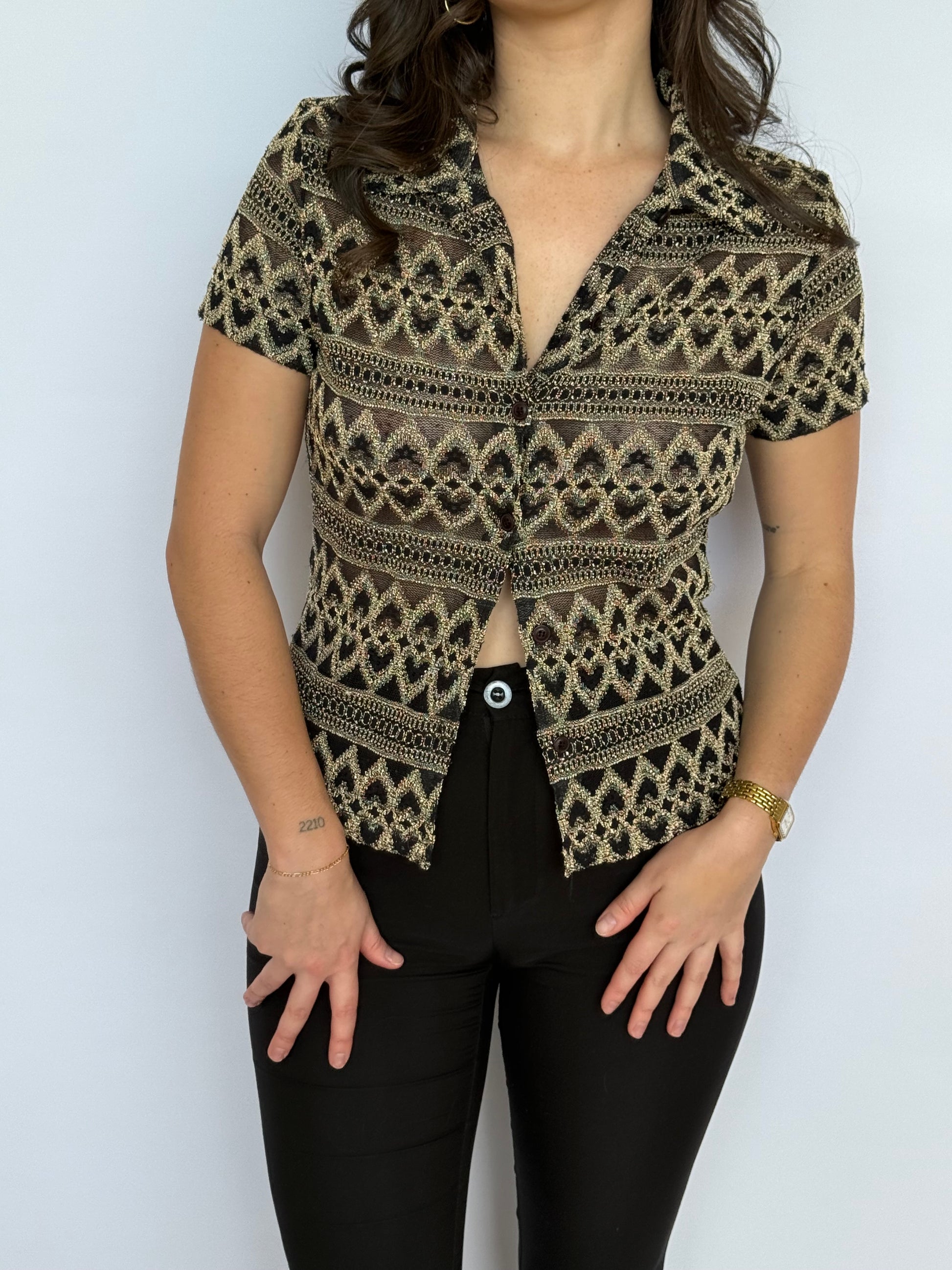 Y2K gold and black shirt featuring delicate lace-effect fabric with a six-button closure down the front. The luxe metallic tones and textured fabric make this a statement piece for evening wear. Style tucked into high-waisted trousers for a sophisticated look, or layer under a blazer with jeans for daytime. The gold detailing catches the light beautifully, perfect for parties or special occasions.