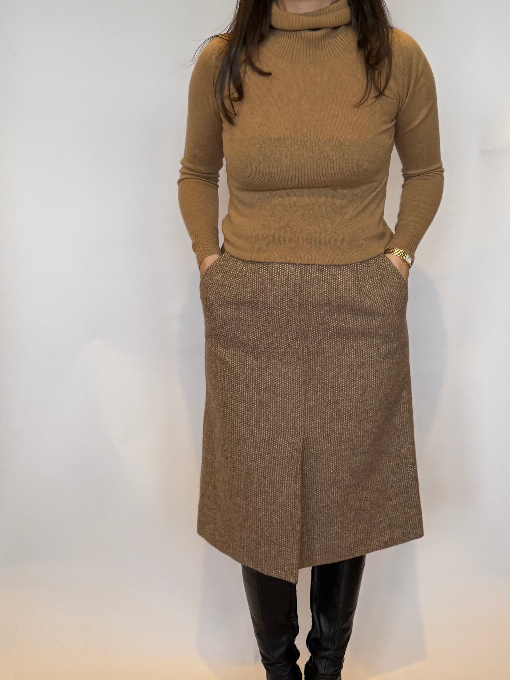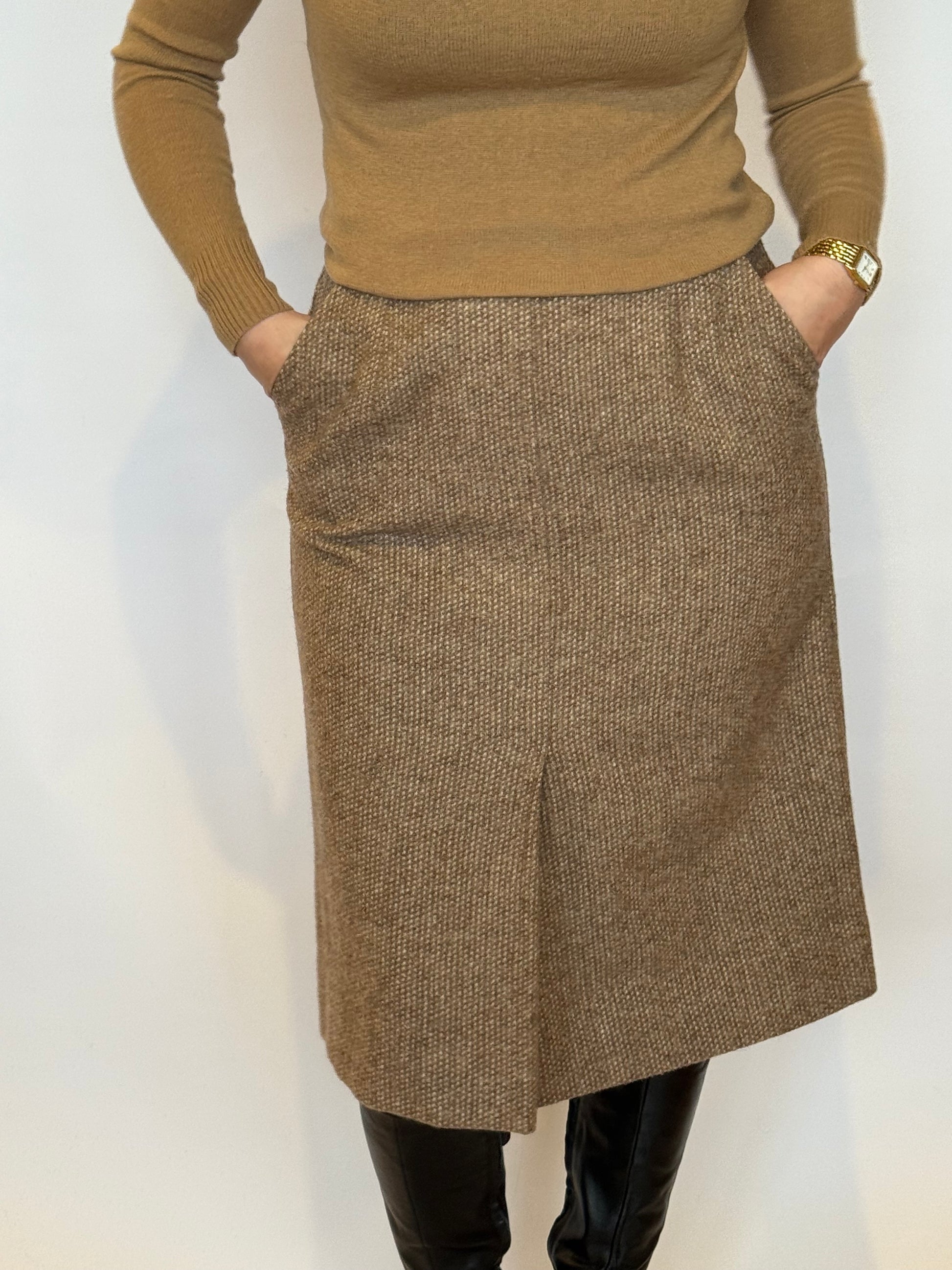 - Tan wool midi skirt - with lining, a split up the bottom front of the skirt, with belt loops, two pockets at the hips and a zip and button closure up the back