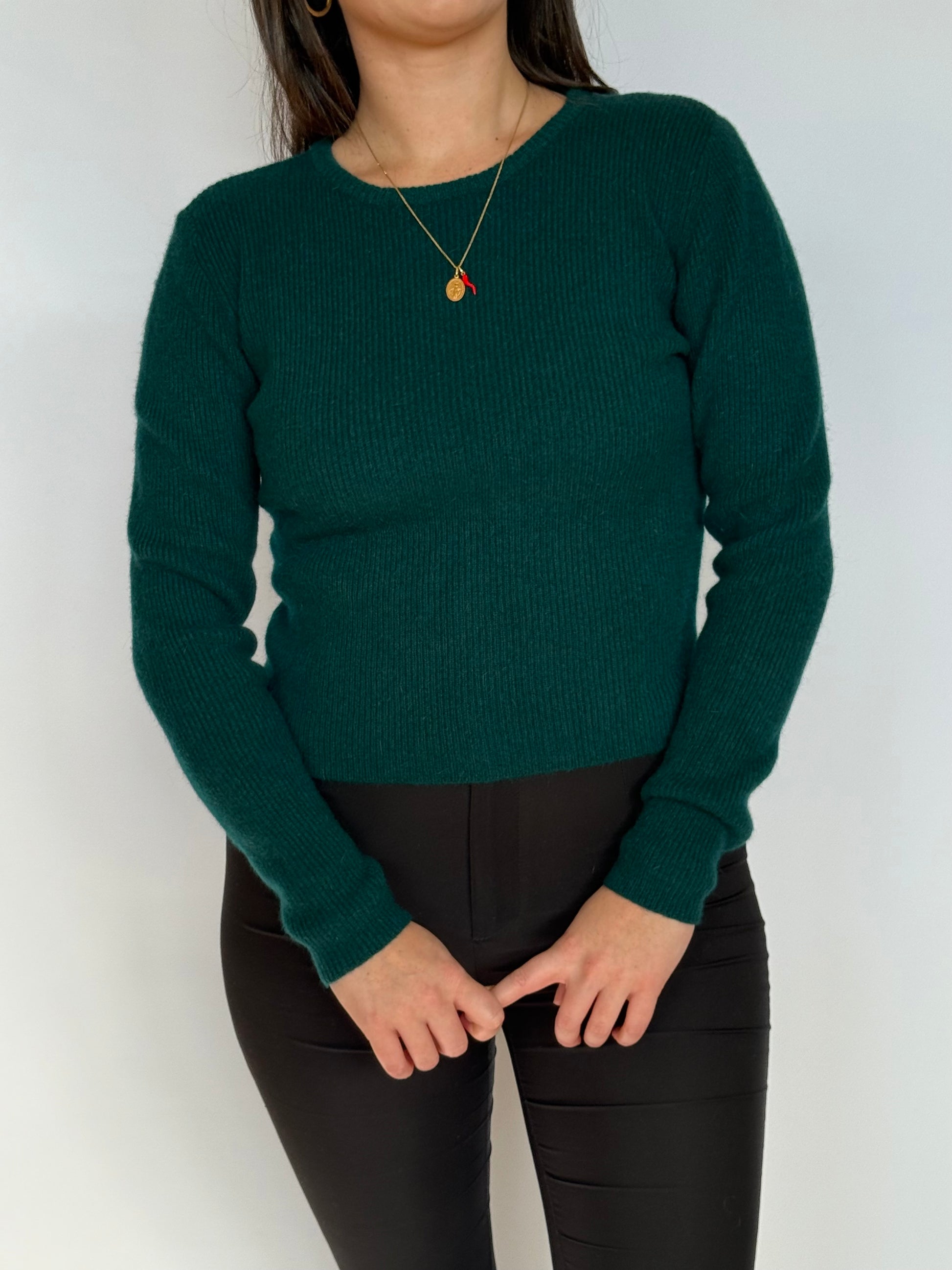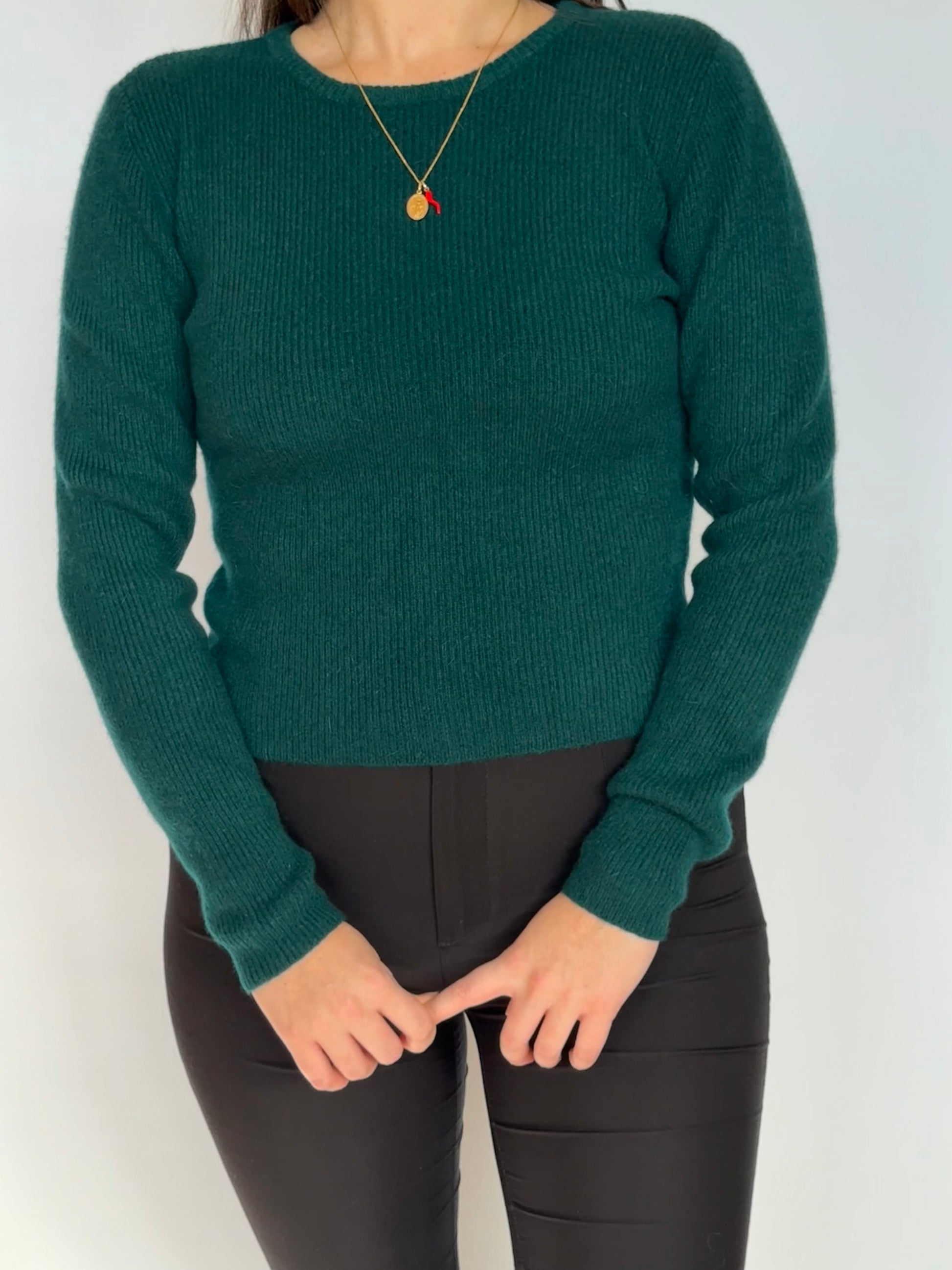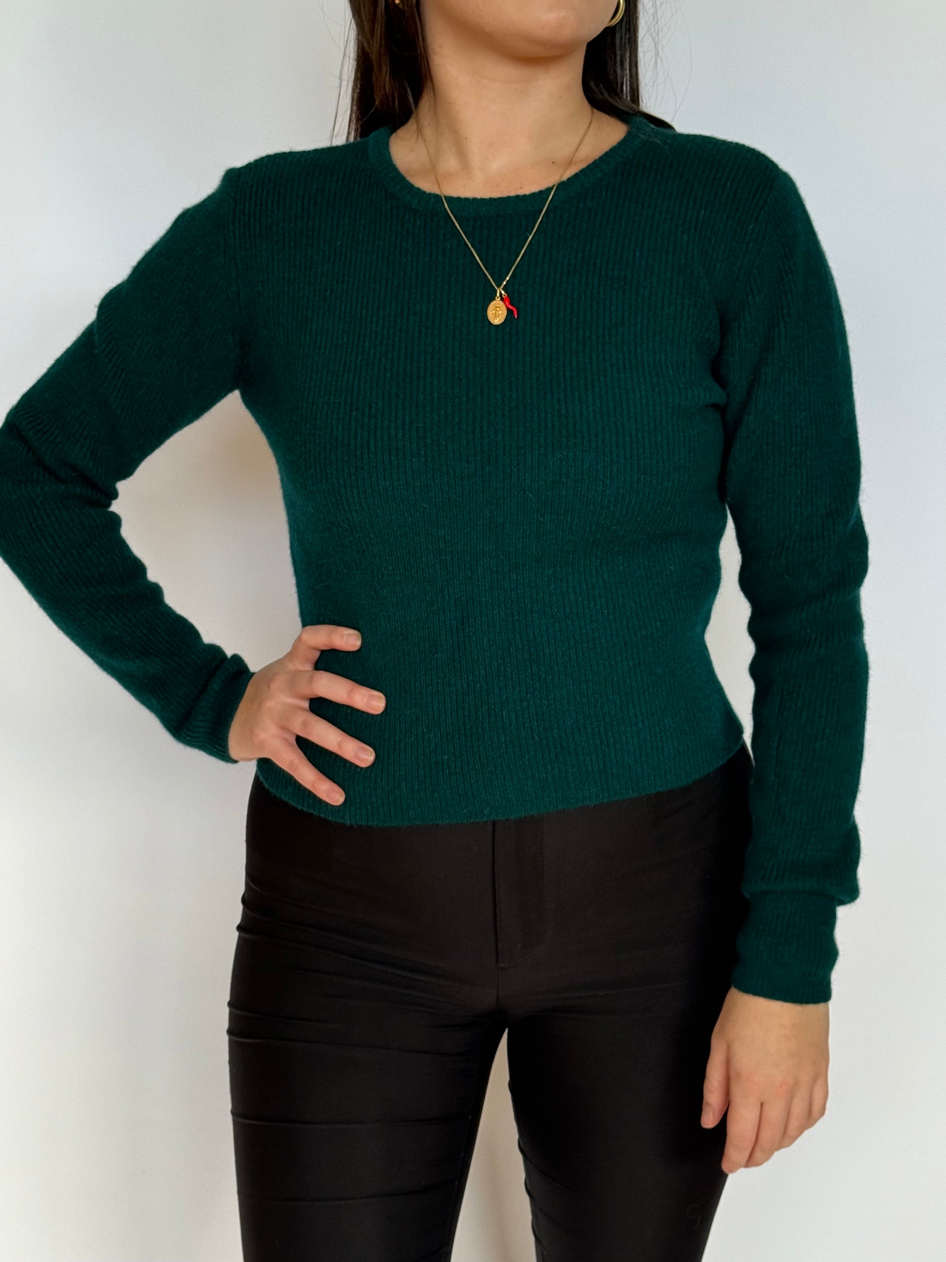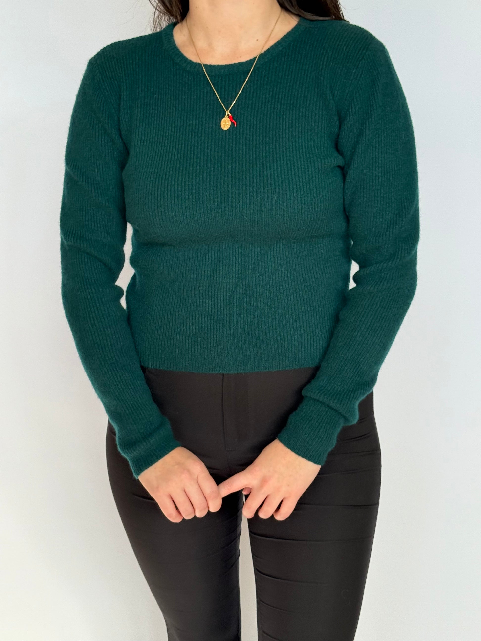 - Green wool jumper knit with ribbing at the neckline, super soft and snuggly for layering