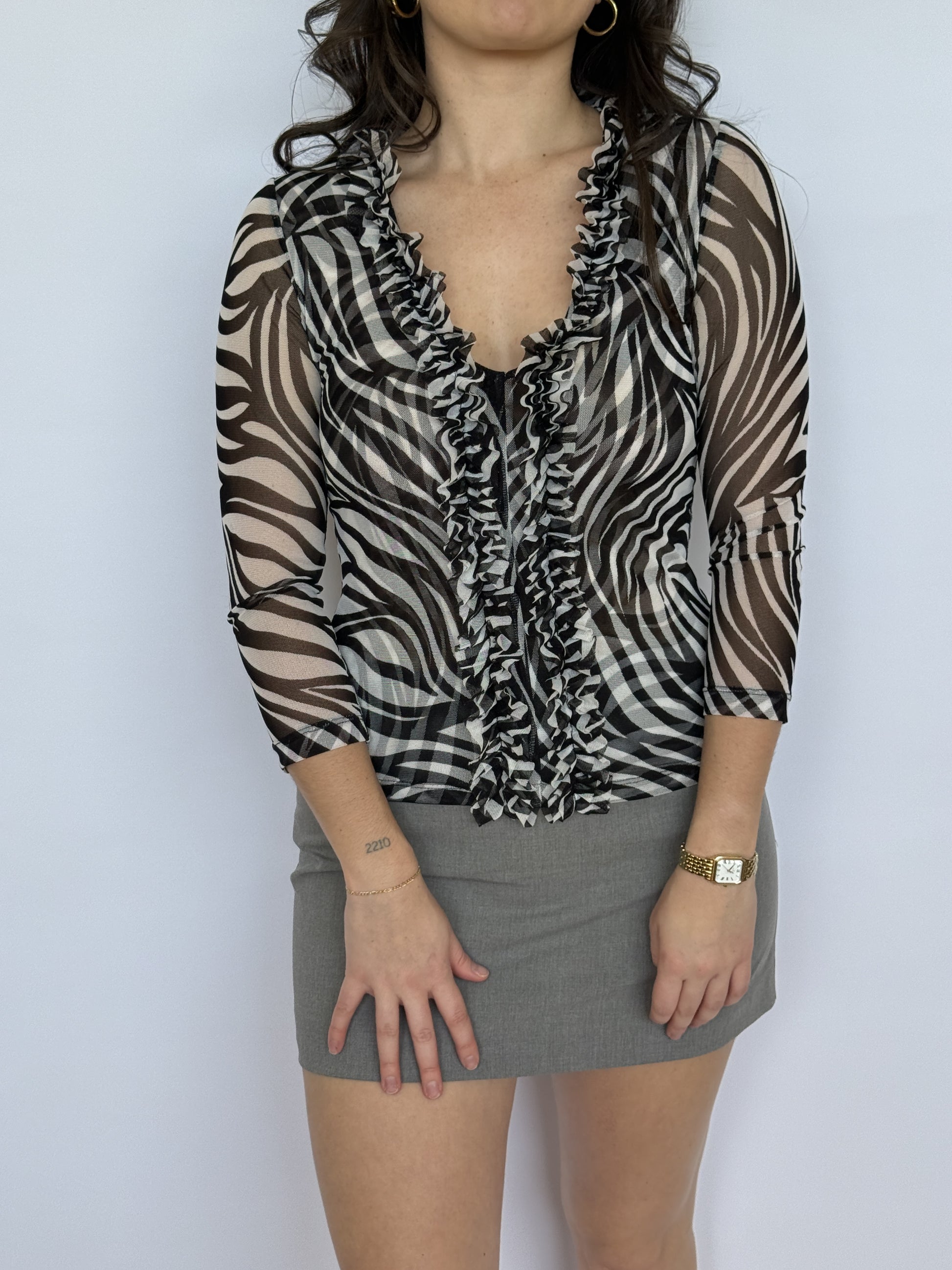 Mesh zebra print v-neck top with ruffle detailing along the neckline and front, featuring three-quarter length sleeves. The stretch mesh fabric makes it easy to style - wear with low-rise jeans for a 2000s look, or layer over a cami with tailored pants.