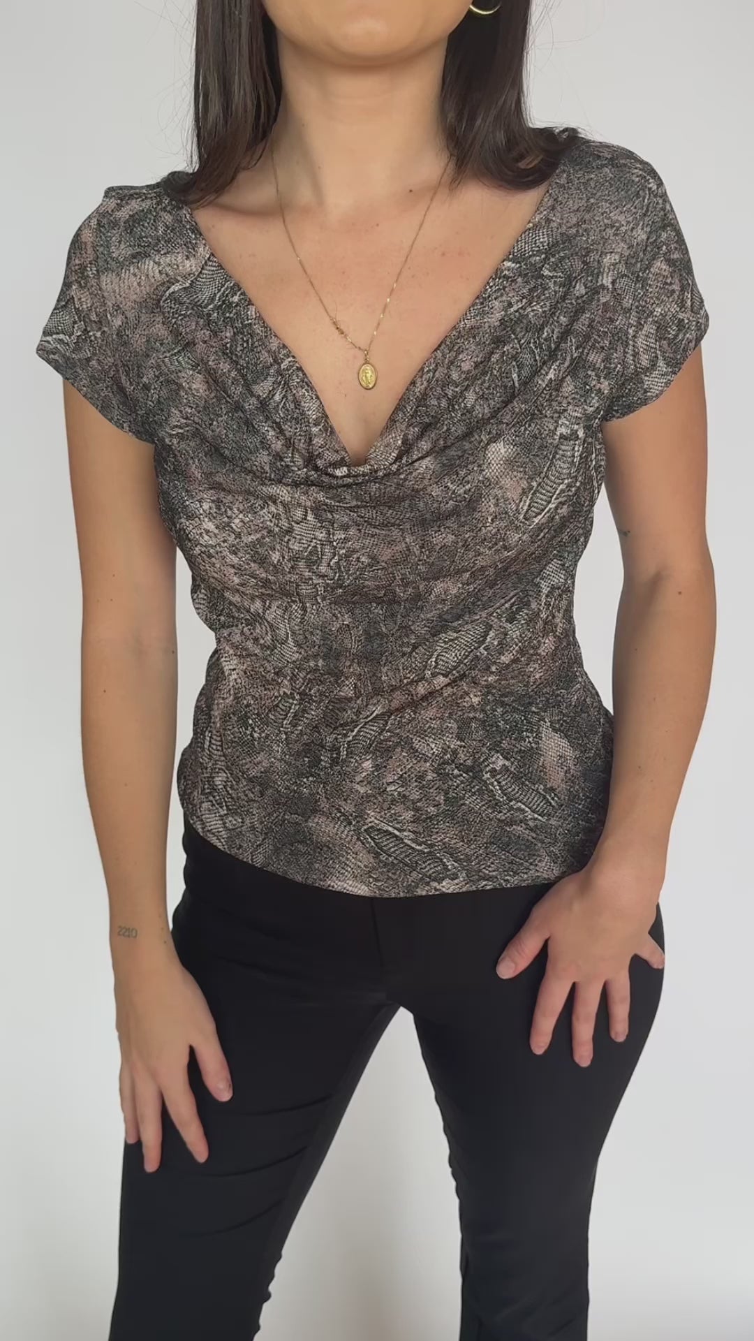 - Snake print cowl neck top with short sleeves or can be styled off the shoulders